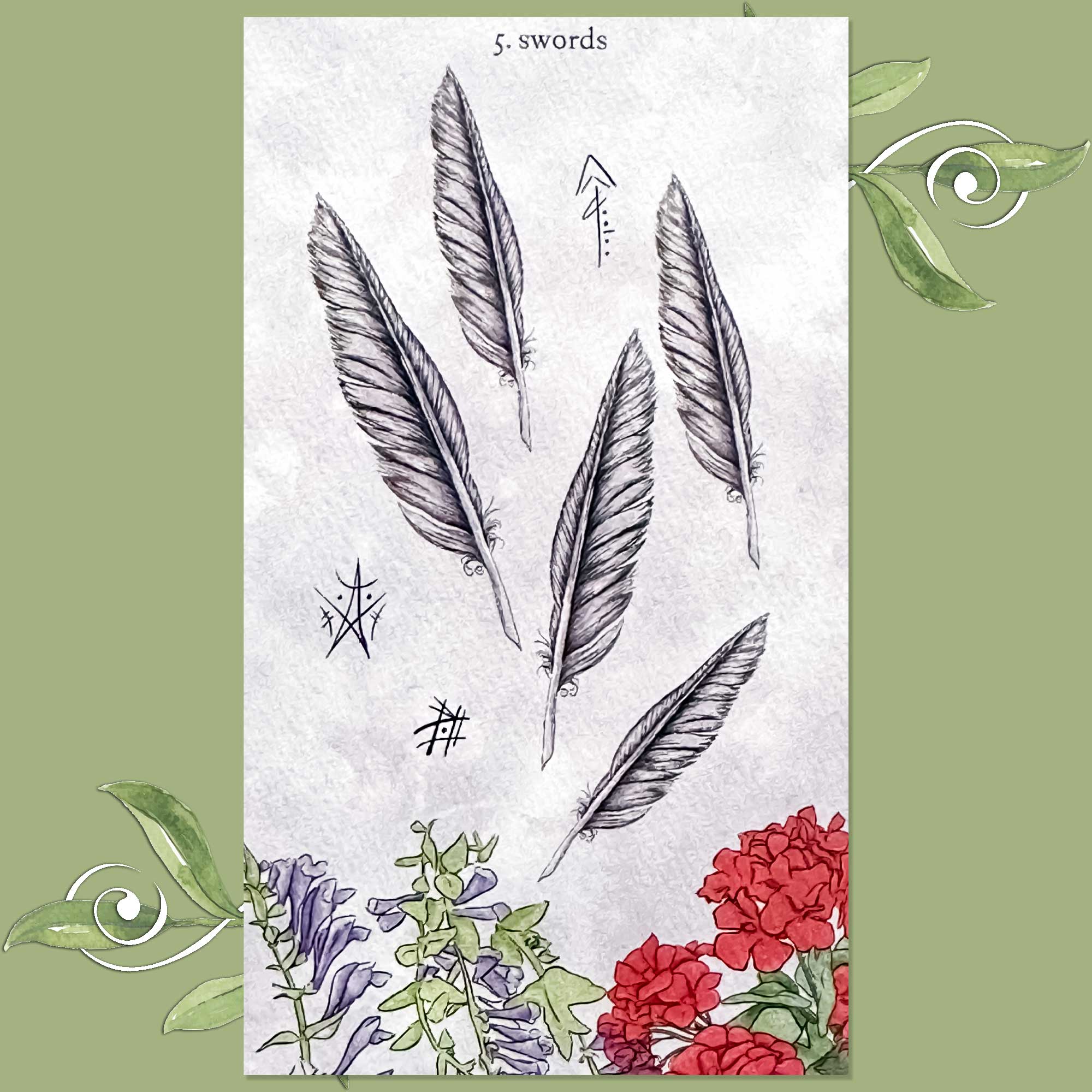 What stands out to me in the imagery for this card is not the feathers hanging in the sky, but the flowers that gather at the bottom and the promise of danger that they pose. It feels that they are a reminder that there are two different types of people when their angry. There’s the type full of flash and fire that will confront you head on, and the quiet type that will simmer in silence but is far more toxic and dangerous in the end.