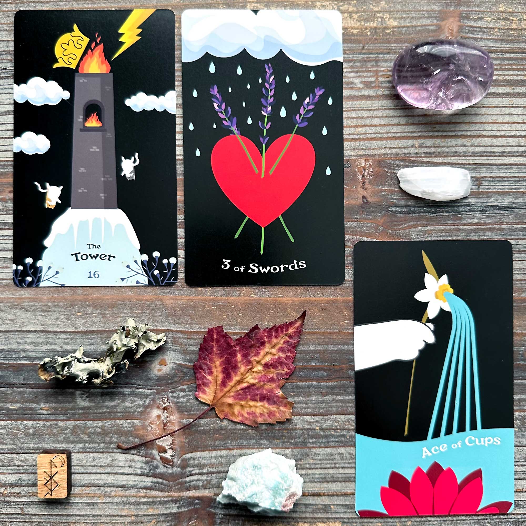 Reading Summary: Tower moments (The Tower) and disappointments (Three of Swords) are the universe’s way of telling you that something needs to change in order for better things to come (Ace of Cups).