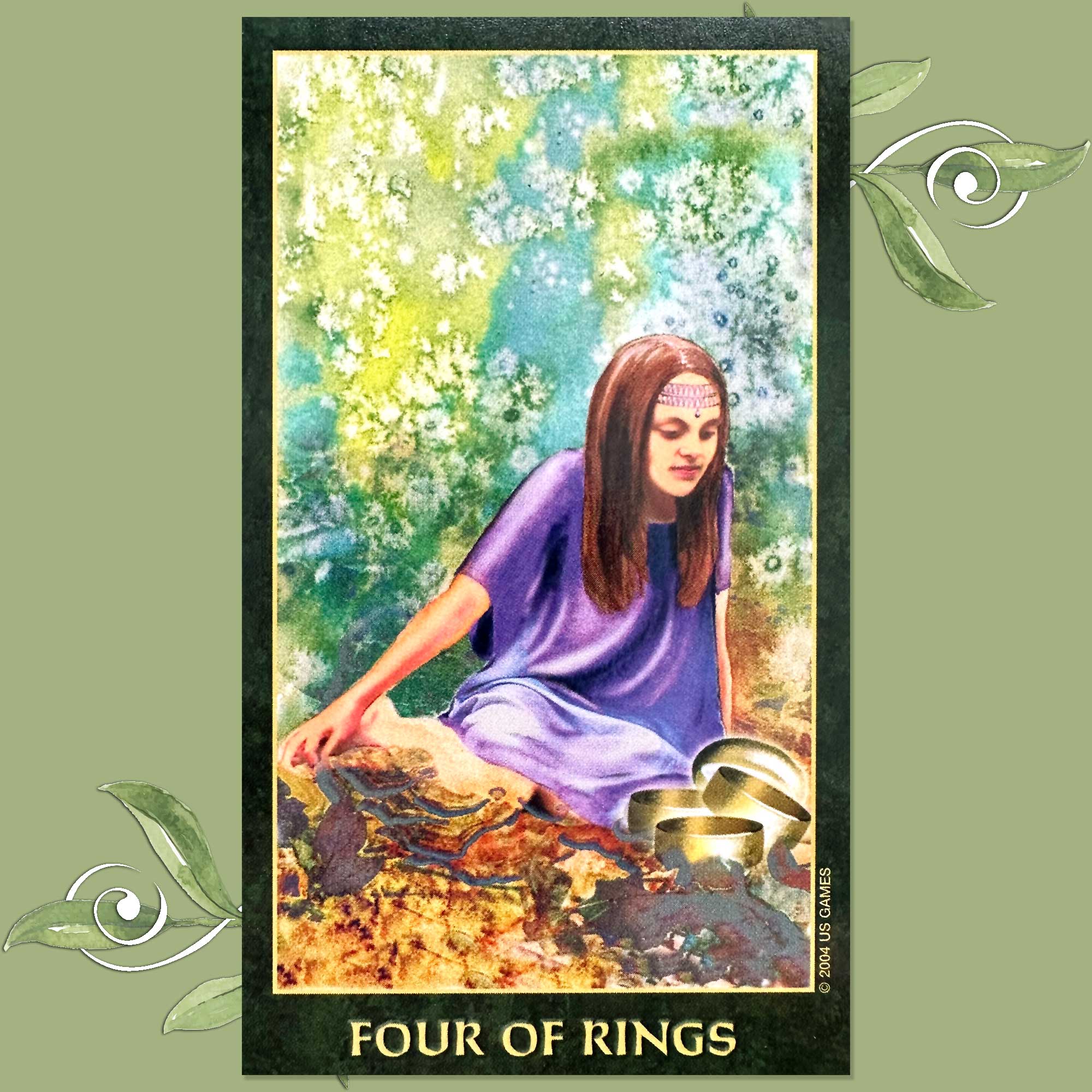Today’s draw is the Four of Rings (Pentacles), which is traditionally a representation of stability and making grounded decisions pertaining to one’s health, home life, finances, resources, or manifestations. It can also be an indication of being miserly or valuing money or resources above all else.