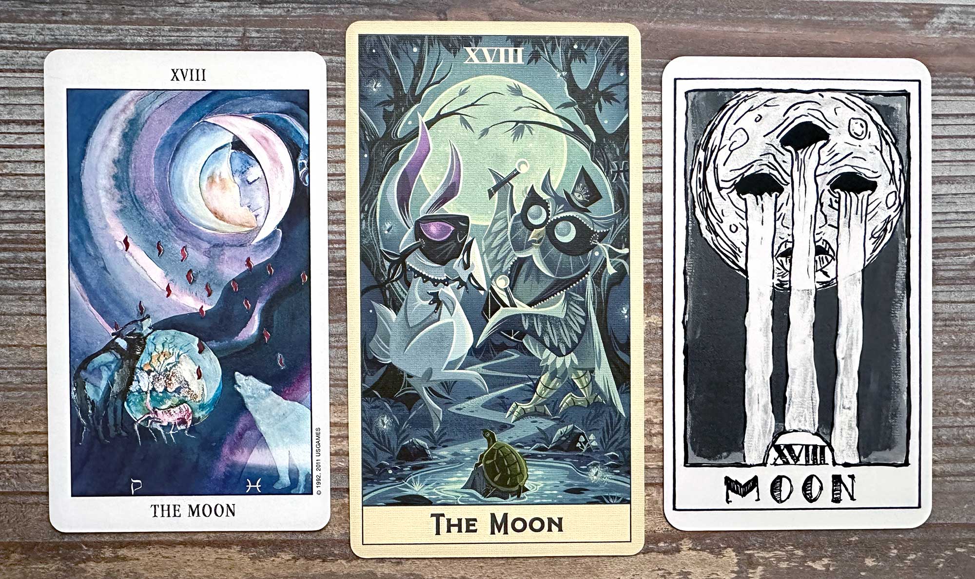 Prompt: “Pull the Moon card from your deck(s). Compare the imagery between the card provided below and the card(s) from your own deck(s). How would you read them differently and why?“