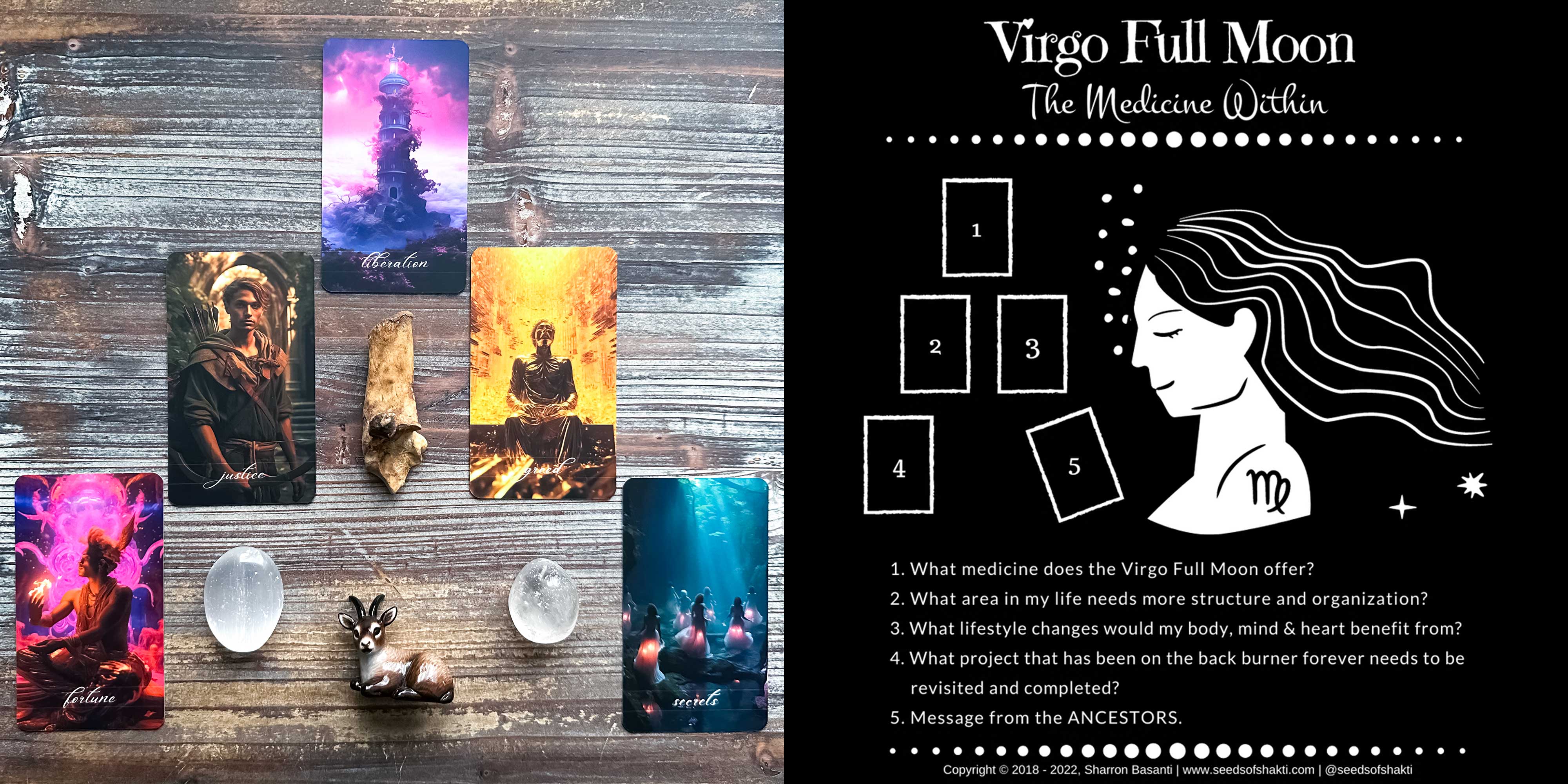 Tomorrow is the full moon, and like all new moons and full moons, I did a spread aligned to the moon’s current themes as a part of my recognition of the moon’s cycle and influences upon us. Todayโs spread is courtesy of Seeds of Shakti.