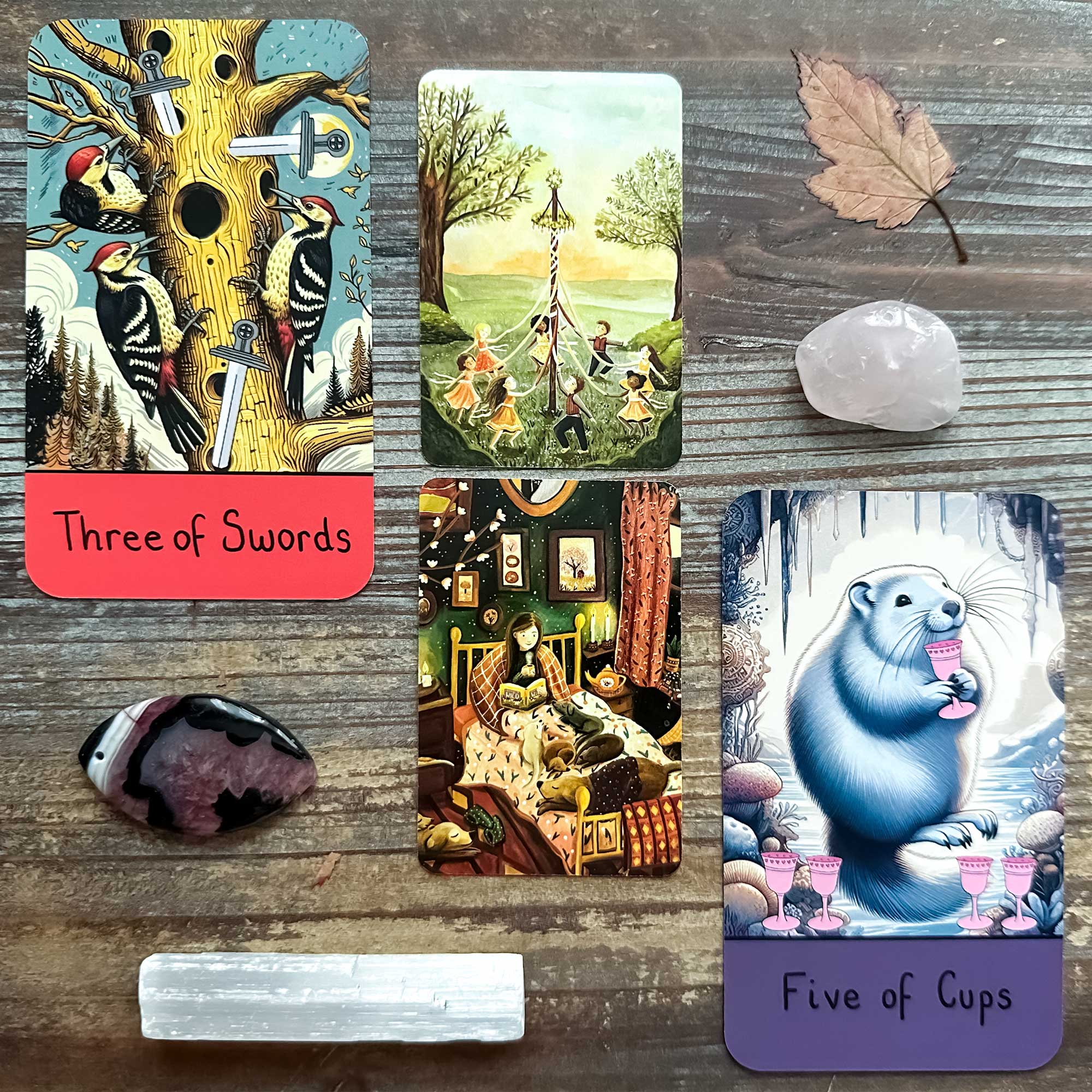 Five of Cups and Cuddle Time – The Cuddle Time card says “I am safe”. Keep working on the positive thinking and optimism practices that you have begun using in the past few years. It helps keep the negative inner voice in your head at bay, and gives your inner child a sense of safety as a result.