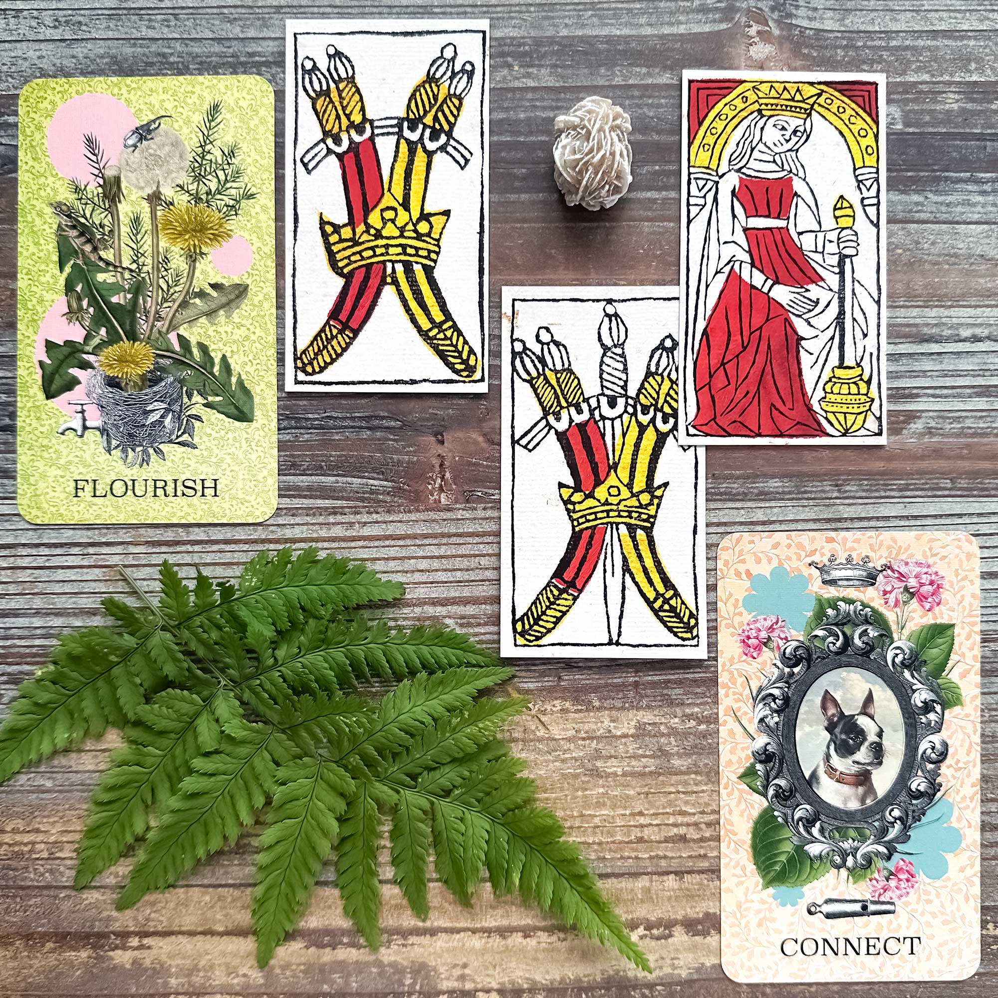 Queen of Wands atop Five of Swords, Connect – Use your innate creative spirit to overcome separation and foster connection between yourself and others.