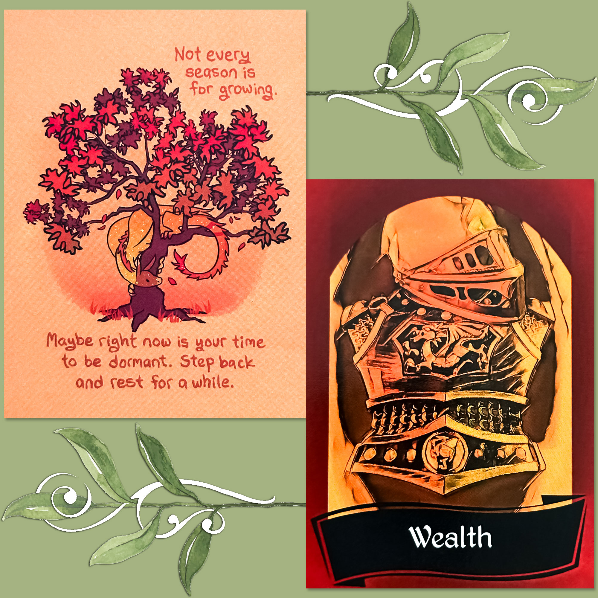 Today’s draw is the Wealth card combined with the affirmation “Not every season is for growing. Maybe right now is your time to be dormant. Step back and rest for a while.”