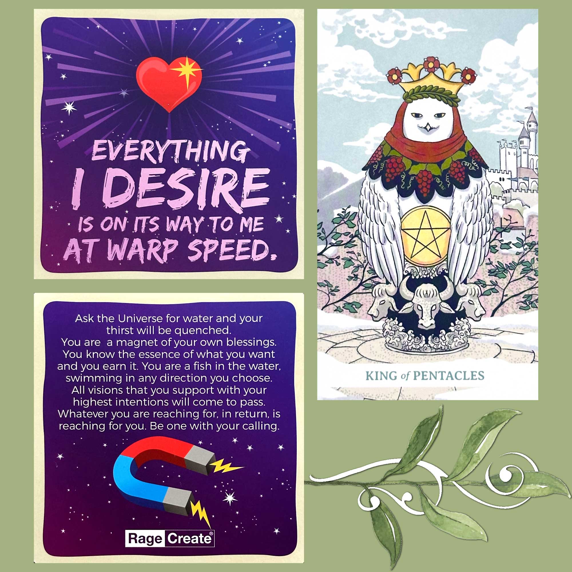Today’s draw is the King of Pentacles combined with the affirmation “Everything I desire is on its way to me at warp speed.”