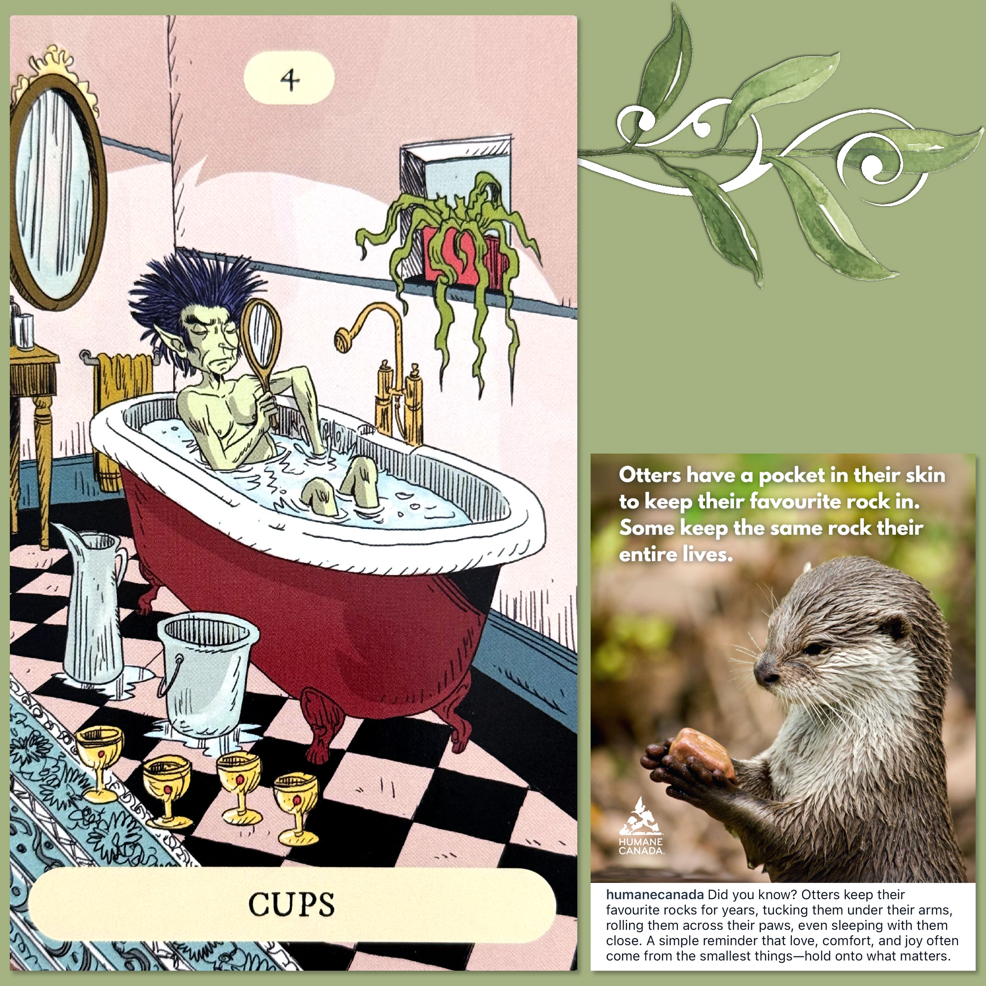 During today’s meditation, I focused on the information in the graphic about otters and their rocks.  I had no idea that otters had special rocks, or a pocket to carry one around in.  I think that’s incredibly sweet, though. I’m a big fan of otters and often watch them play in live zoo feeds, as well as in rescue/recovery videos and other social media.  They are very playful and community minded, and I i find the idea that they have this “one good thing” that they choose to carry with them wherever they go to be incredibly sweet.