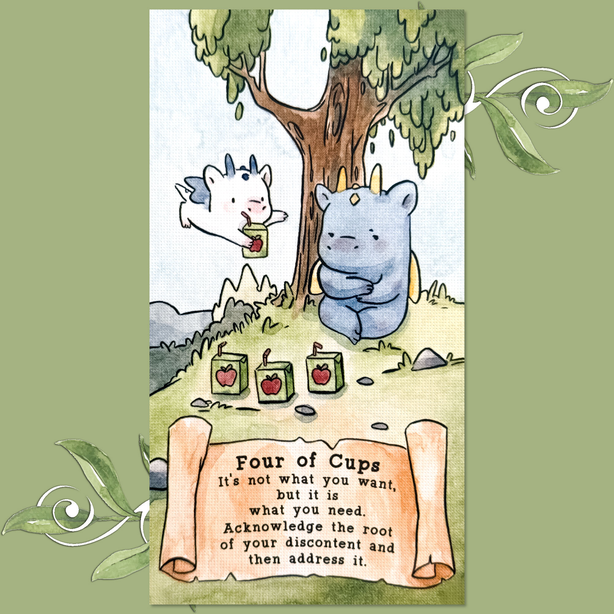 Today’s draw is the Four of Cups, which is traditionally a representation of dejection, refusal of assistance, contemplative moments, meditation, and feelings of apathy.