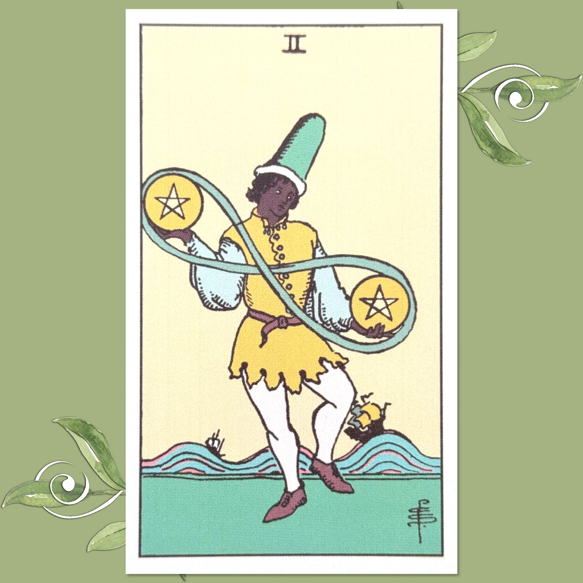 Today’s draw is the Two of Pentacles, which is traditionally a representation of juggling responsibilities, work/life balance, and prioritization.
