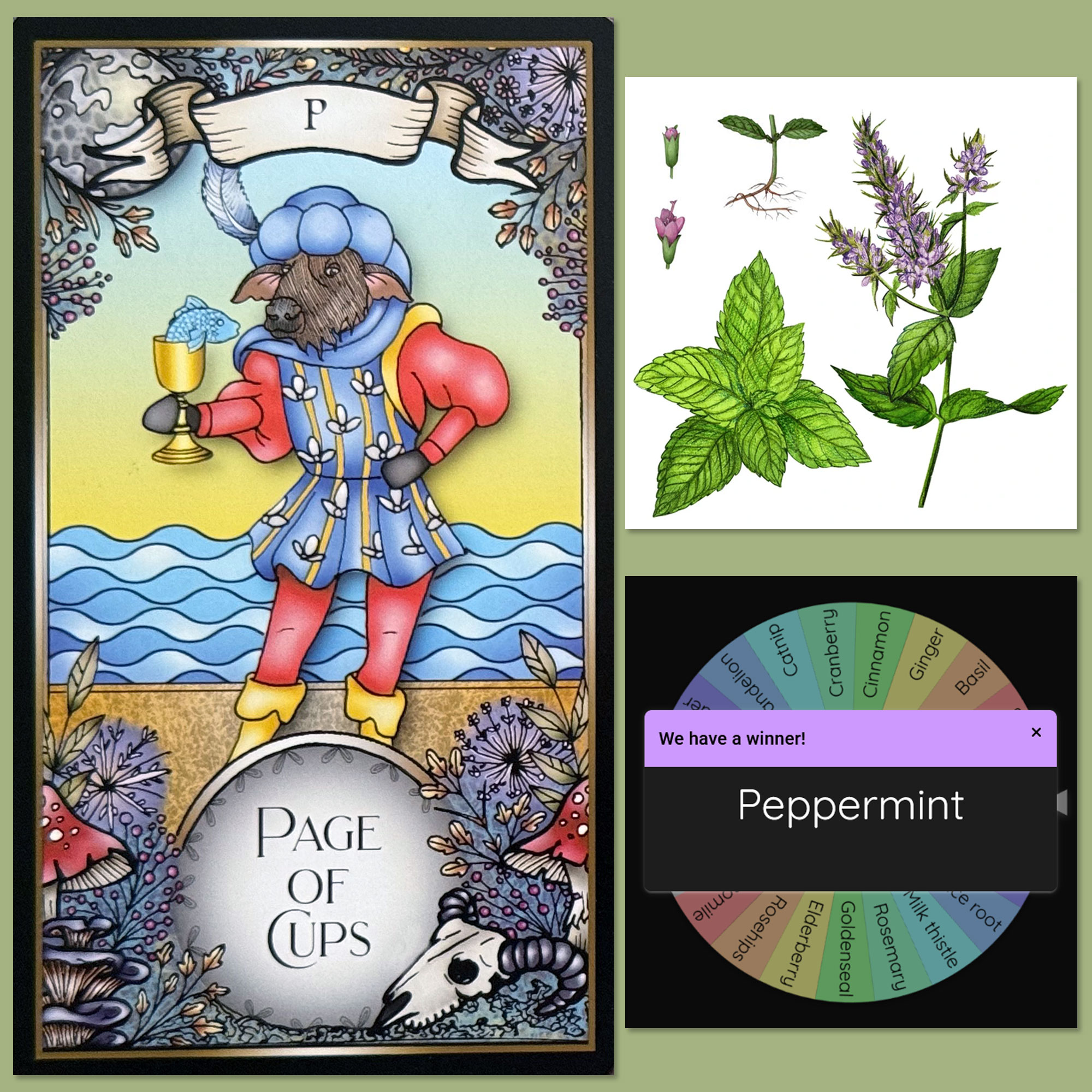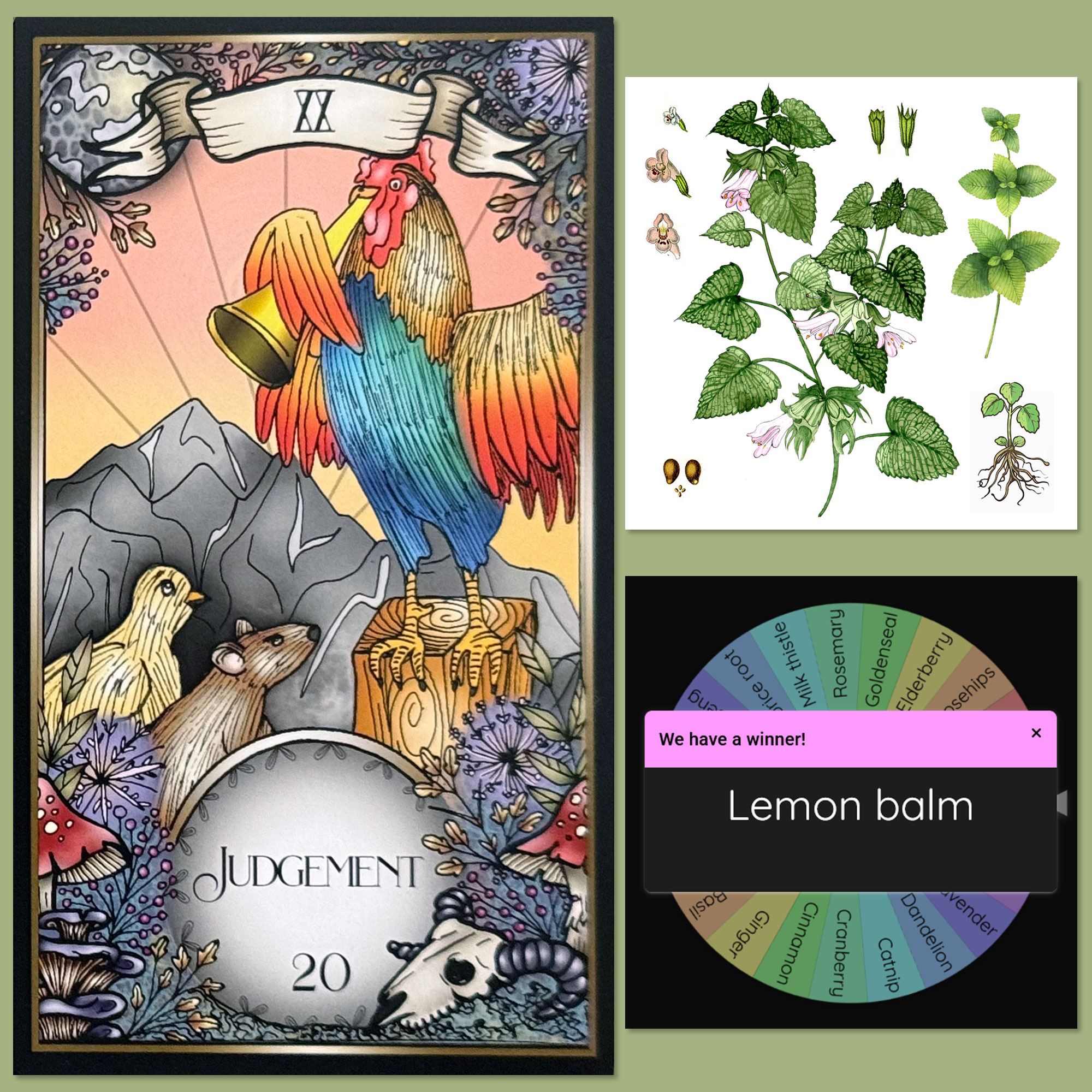 Prompt: “Pull a random card, then spin the wheel to be given an herb to work with. Share with us your card, and tell us what similarities or differences you find between the herb and your card. The info you use can be on any aspects of the herb in question from cooking, growth info, teas, personal experiences with the plant, medical, metaphysical, etc.”
