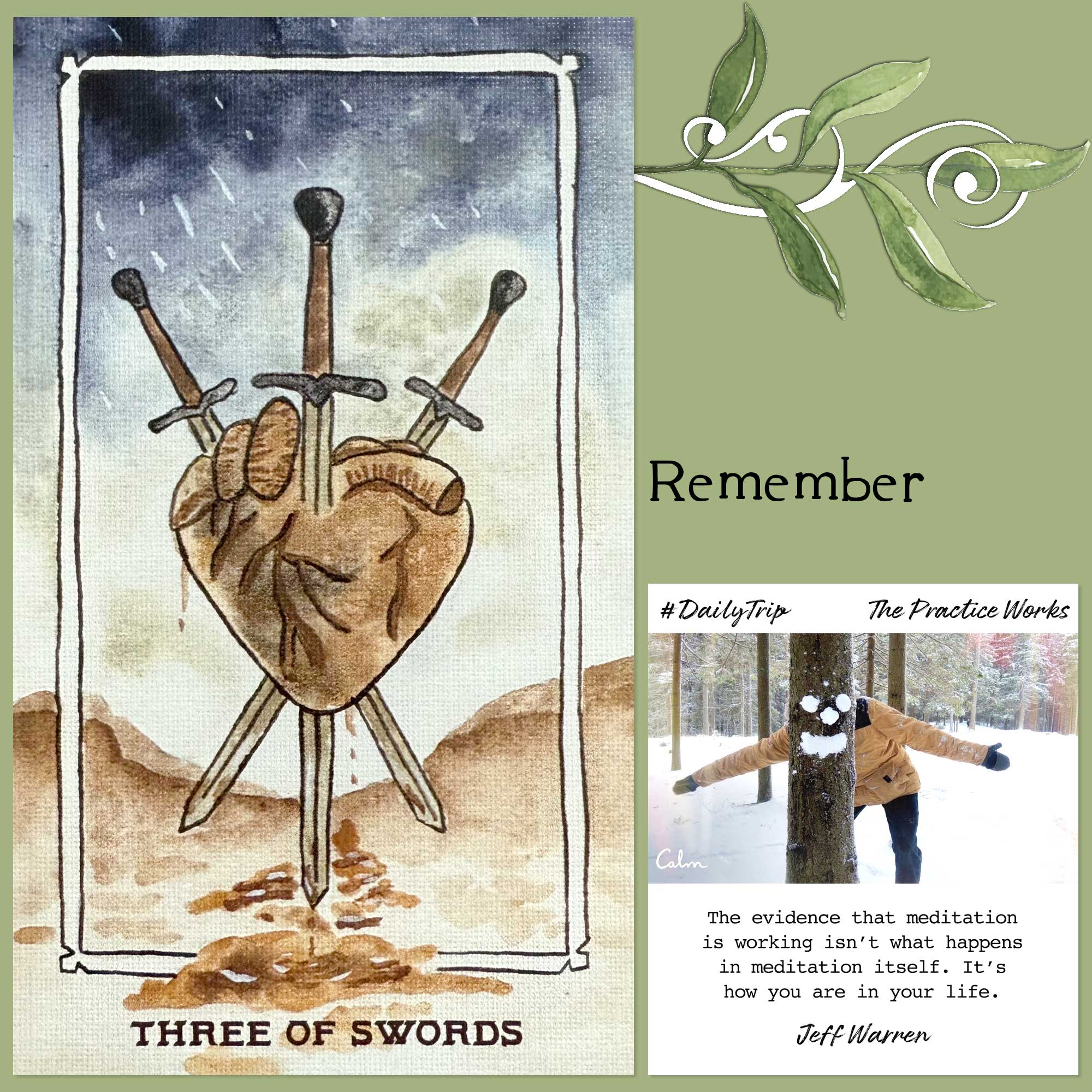 Today’s draw is the Three of Swords, which is traditionally a representation of depression, grief, and disappointments. This theme often seems strange to people, being that it is seated in the Swords suit (which is often all about intellect and the mind), but it is important to remember that how we react emotionally is often rooted in how we think and what expectations we create for ourselves before everything falls apart.
