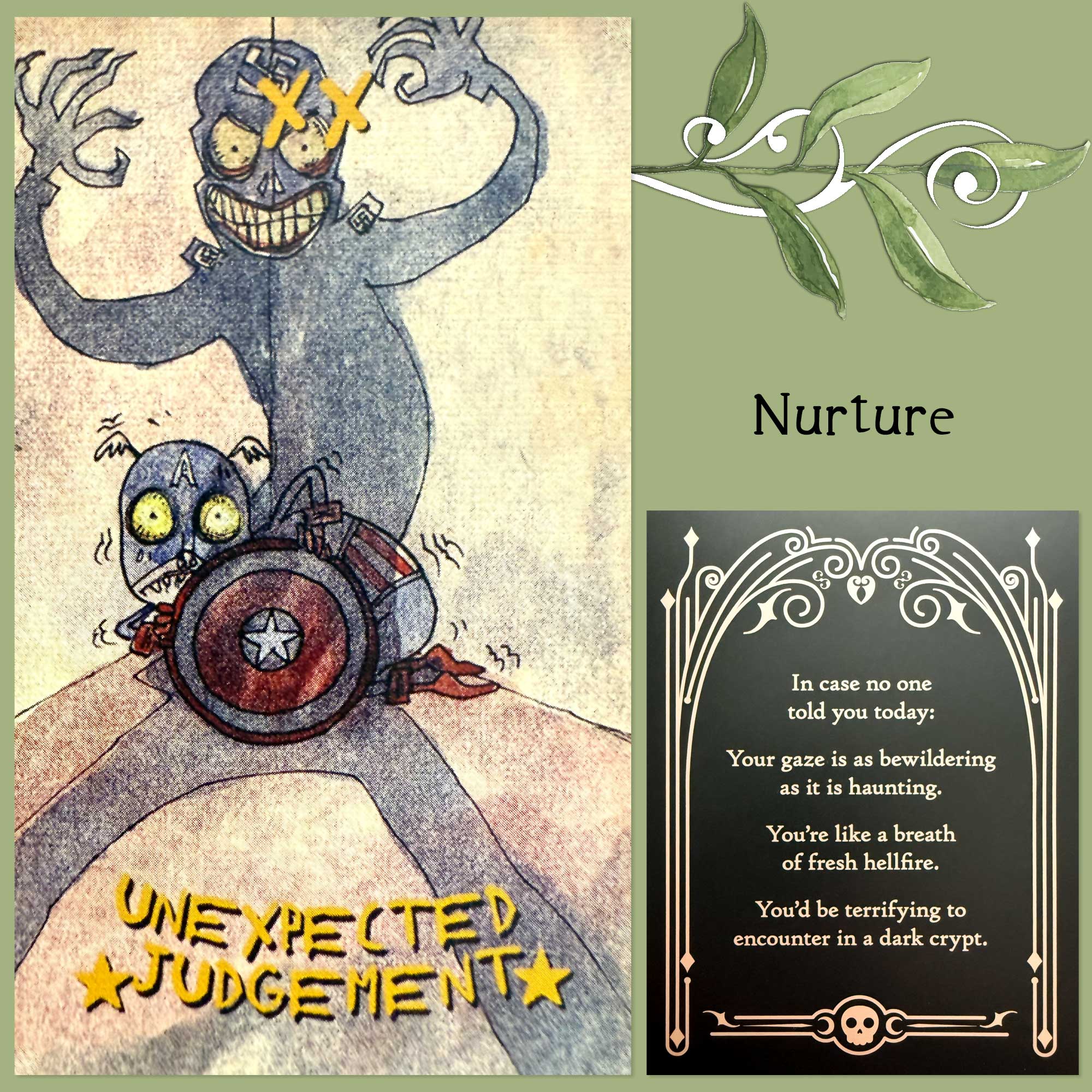 The Judgement card has then been combined with an affirmation card from the Sinister Affirmations deck, which says,”In case no one told you today: Your gaze is as bewildering as it is haunting. You’re like a breath of fresh hellfire” You’d be terrifying to encounter in a dark crypt.”