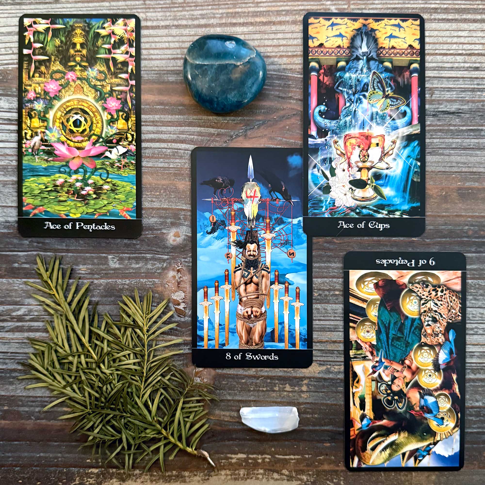 Reading Summary: Starting over is never easy, and can always be confusing (imagery in the Ace of Pentacles). It can be worse, though, if you allow your emotions to start overriding good sense (Ace of Cups atop Eight of Swords). Leaning on your emotions alone will blind you to pitfalls and lead in the direction of failure (Nine of Pentacles Rx).