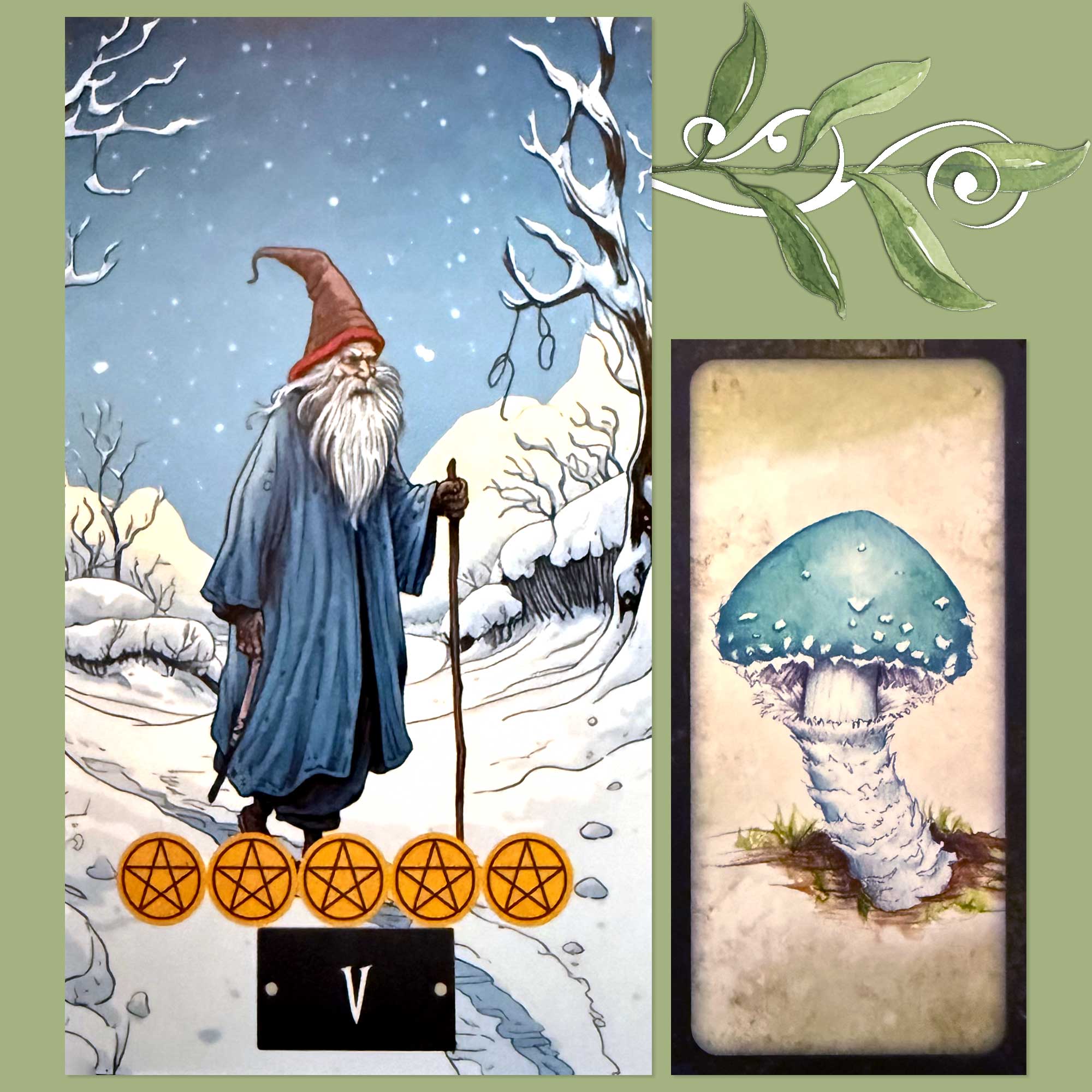 The Five of Pentacles has then been combined with the Verdigris Agaric affirmation card from the Mushroom Affirmations deck, which says, “Now is the time to make an impression. Stand out from the crowd and be noticed.”