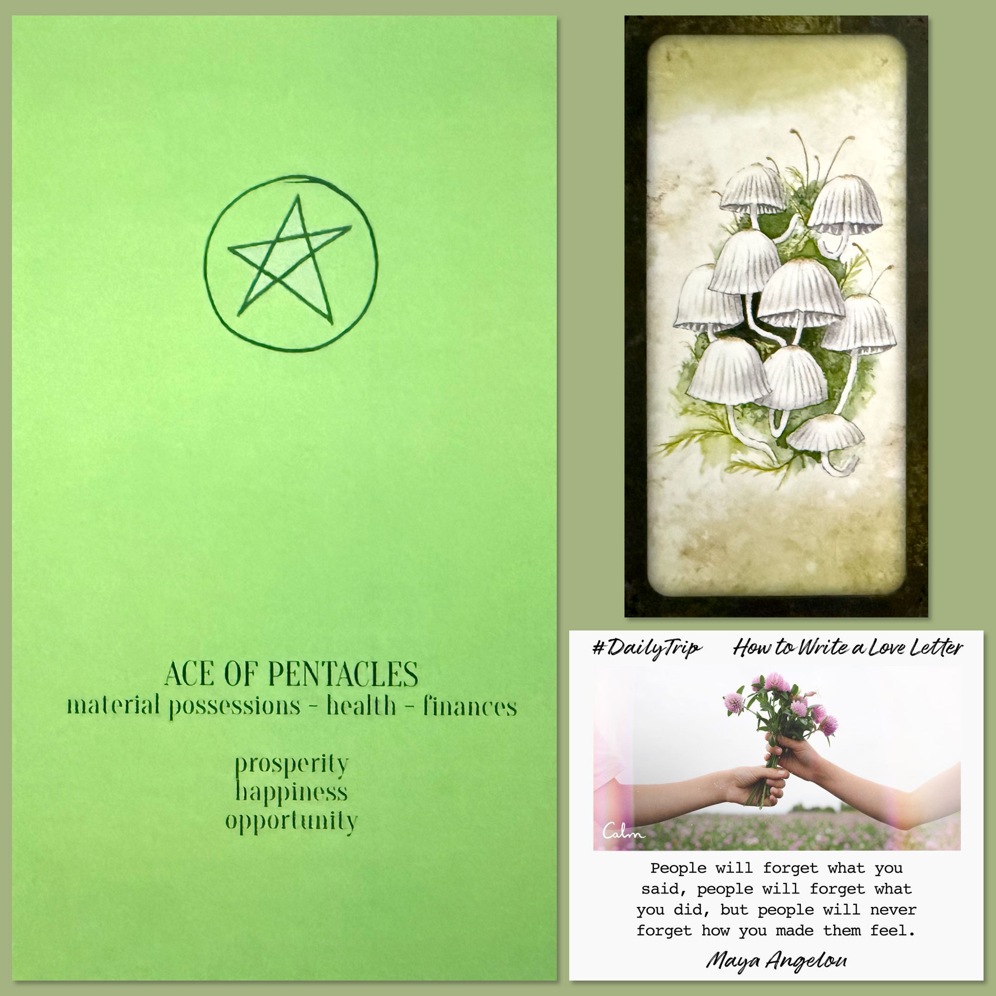 The Ace of Pentacles has then been combined with the Fairy Inkcap affirmation card from the Mushroom Affirmations deck, which says, “Learn to notice the stuff around you. Slow down and be mindful.”