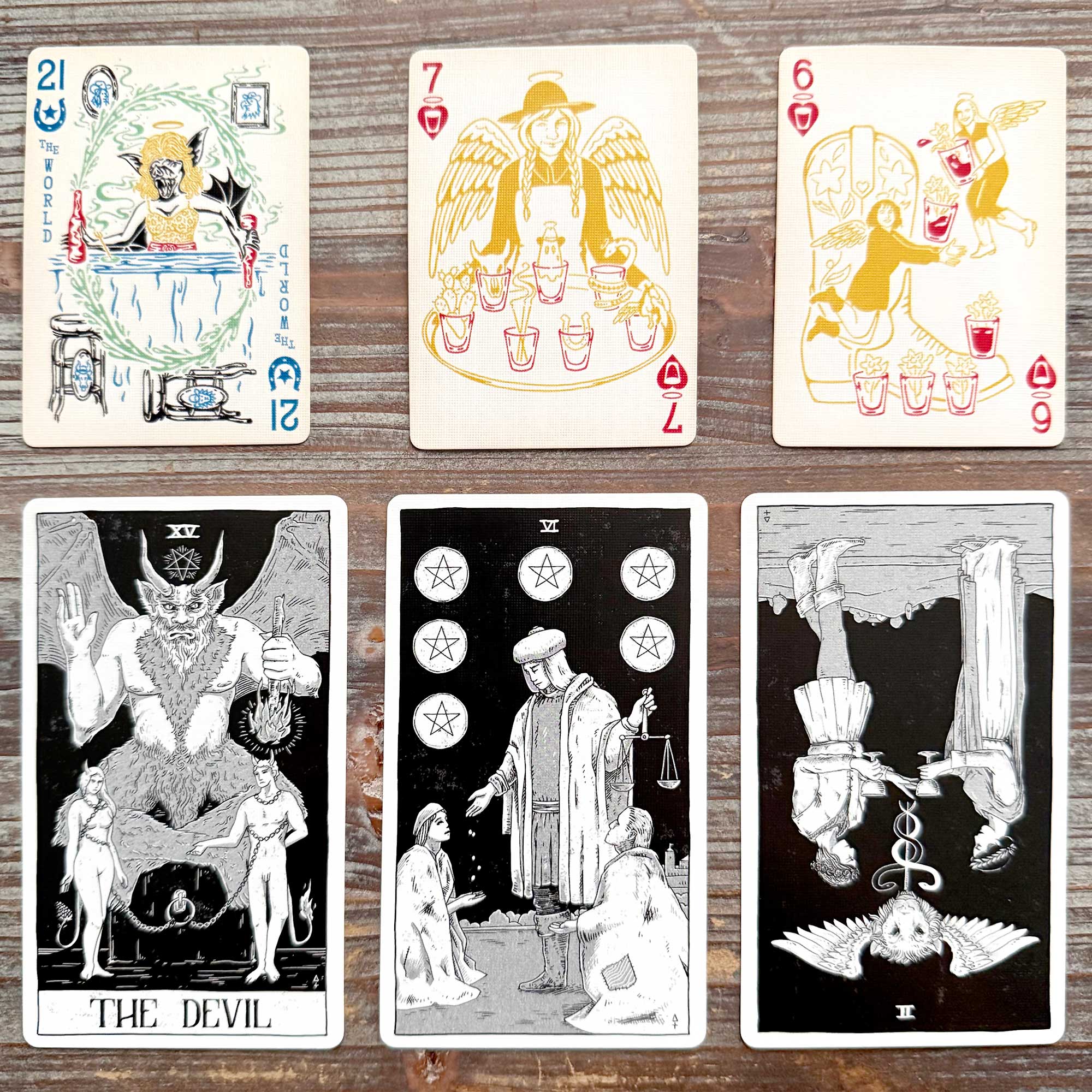 Reading Summary: Indulging in your addictions (The Devil) is not going to give you anything more than you already have (Six of Pentacles). Instead, you’re at the cusp of it turning into something unhealthy (The Lovers Rx).