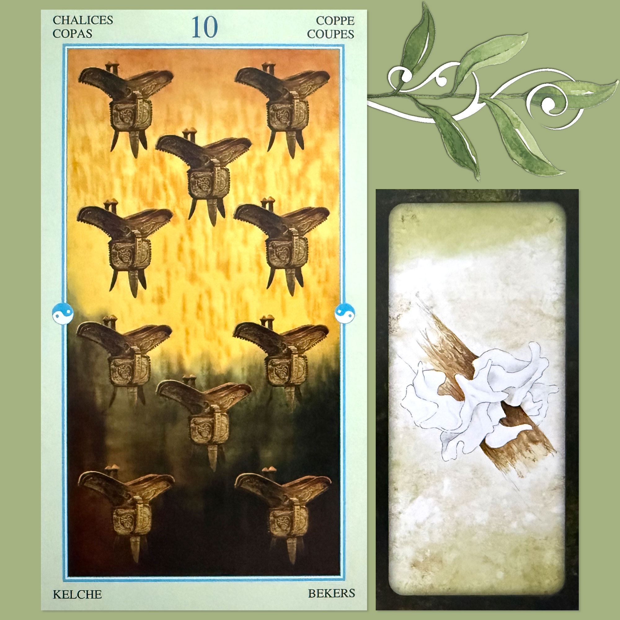 The Ten of Cups has then been combined with the Tremella affirmation card from the Mushroom Affirmations deck, which says,  says, “A time to be fluid. There’s a beauty to softness and restoration.”
