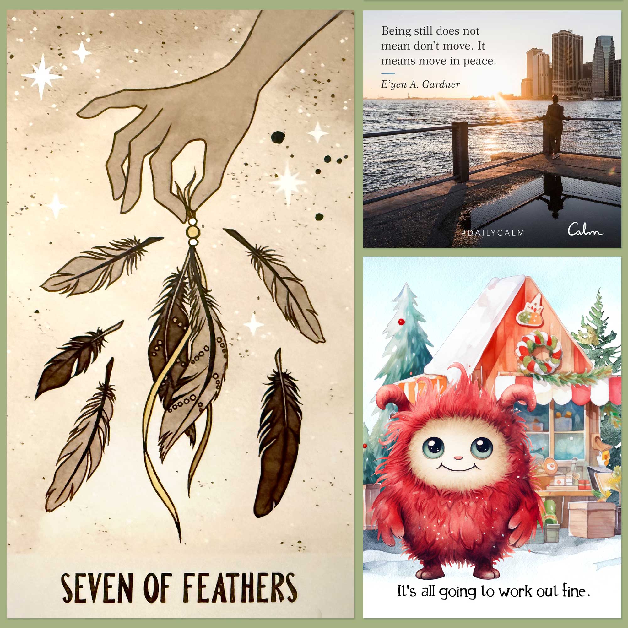 The Seven of Swords has then been combined with one of my Christmas Affirmation cards, which says, “It’s all going to work out fine.”