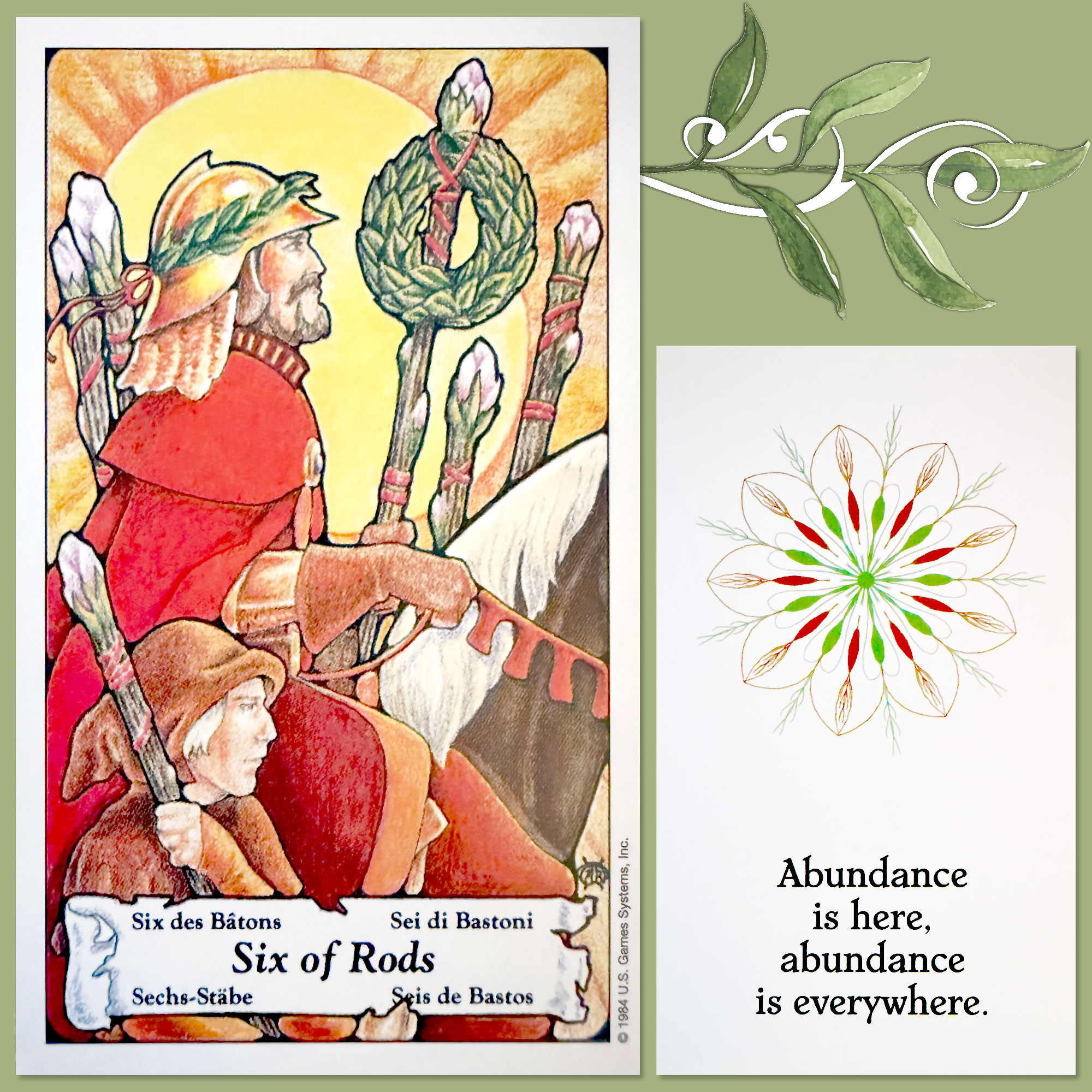 The Six of Wands card has then been combined with one of the Daily Truth Oracle cards, which says, “Abundance is here, abundance is everywhere.”