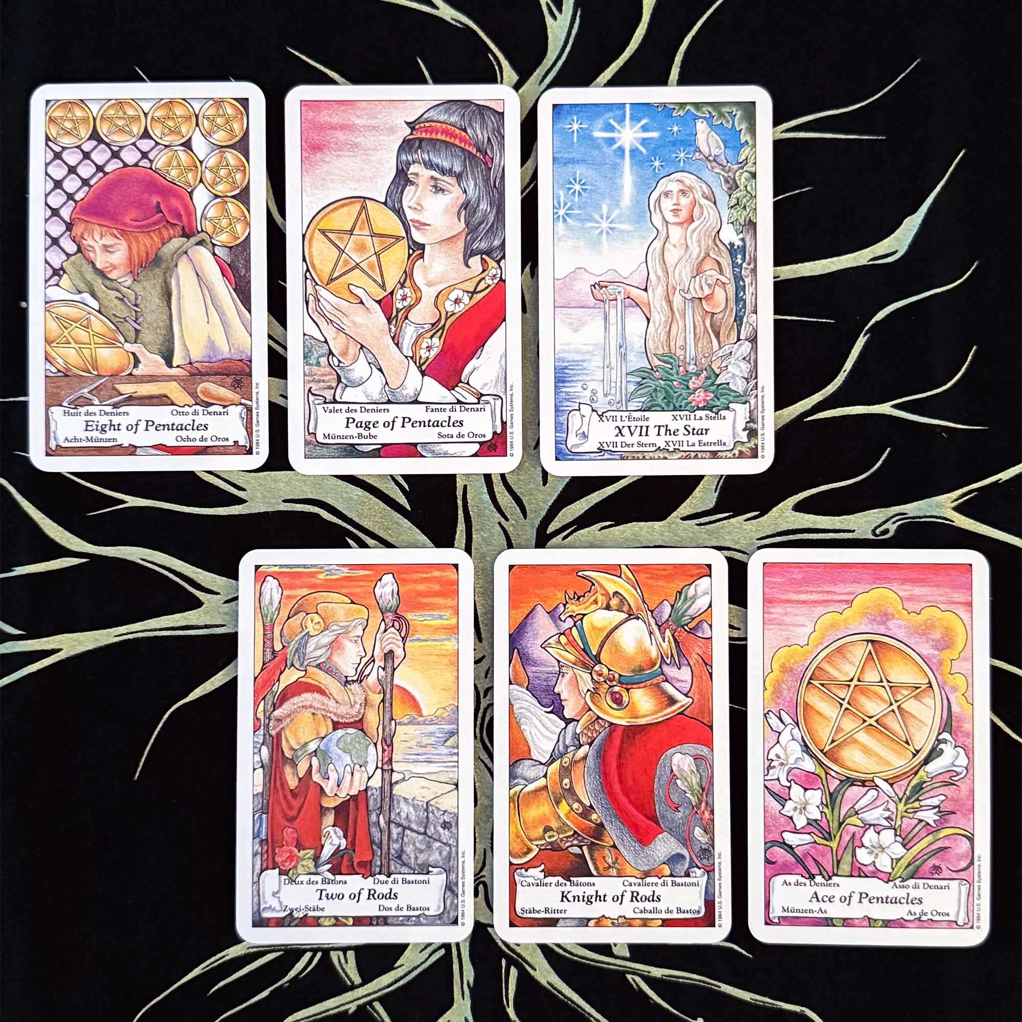 Trust that the new methods you’ve applied to your business practices are going to work out (The Star). Just because they feel new and different right now (Page of Pentacles) doesn’t mean they’re wrong, only that it’s going to take some time to become accustomed to them and skilled at them (Eight of Pentacles).