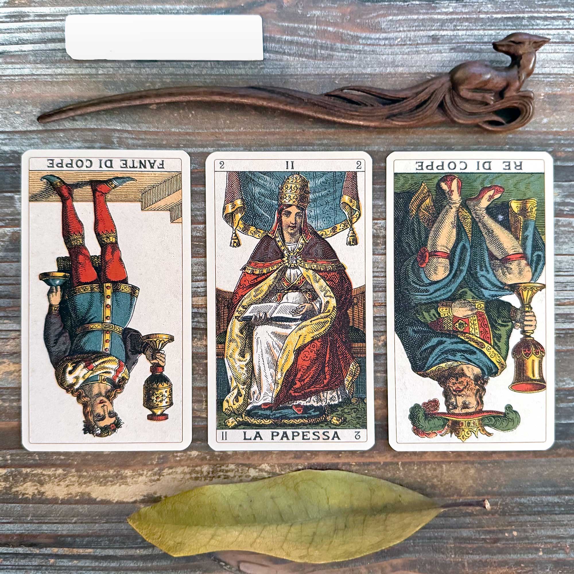 Reading Summary: Just because you have the tools and the knowledge needed to do it on your own (La Papessa), doesn’t mean that you should avoid reaching out for others (Re di Coppe Rx) when emotions become difficult, uncertain, or inscrutable (Fante di Coppe Rx).