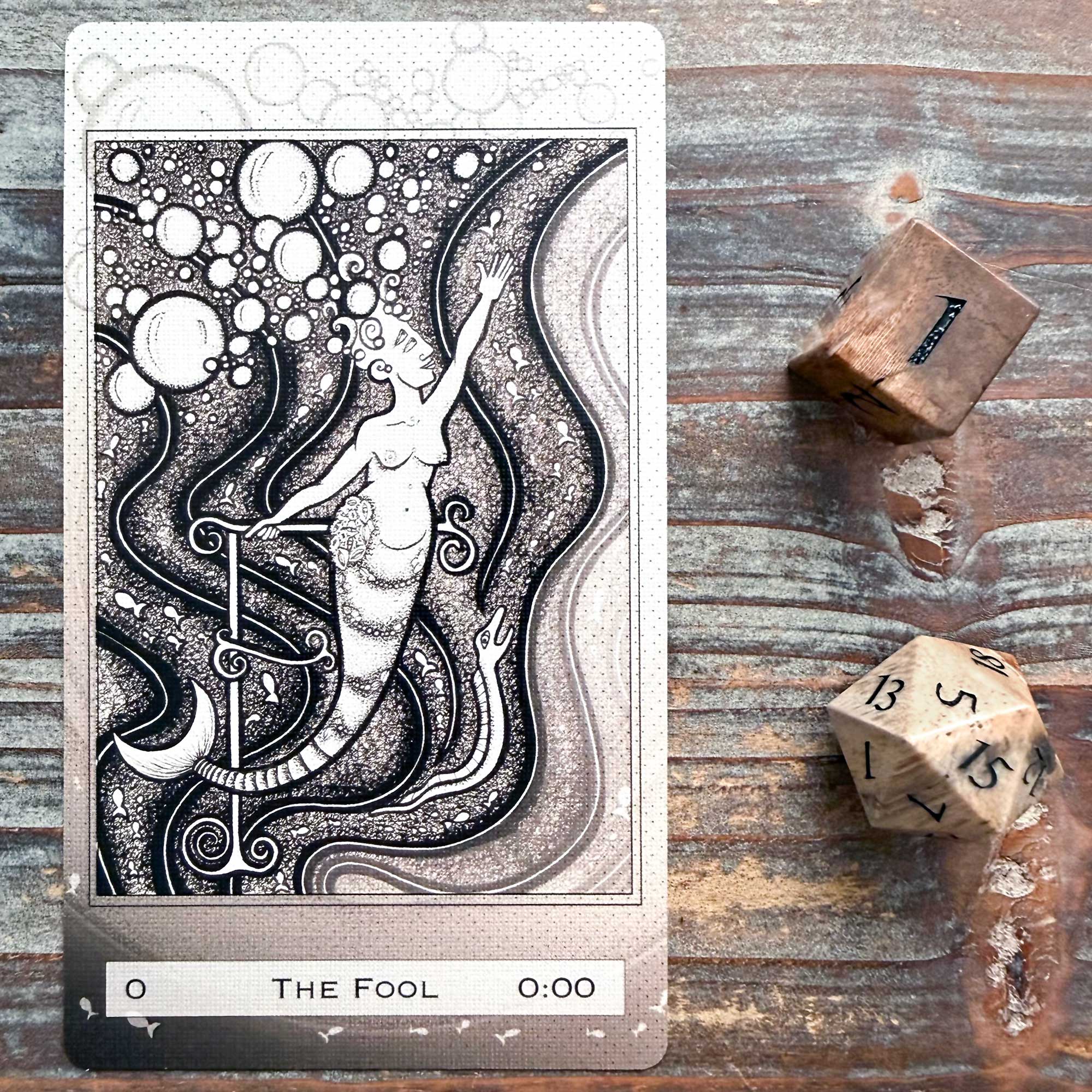 I winced. At first I thought that the upper horizontal line of the F in this card was piercing through the hip of the mermaid, and that the mermaid’s brains were falling out.
