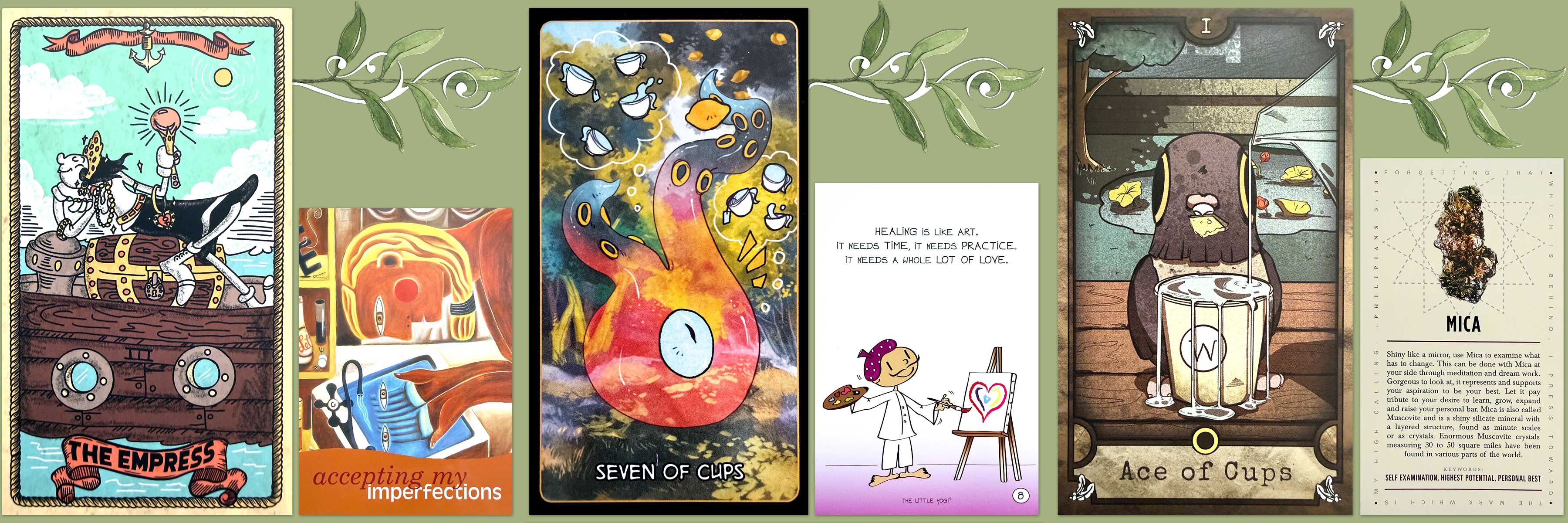 The Seven of Cups has then been combined with an affirmation card from The Little Yogi Happy Notes deck, which says, “Healing is like art. It needs time, it needs practice. It needs a whole lot of love.”