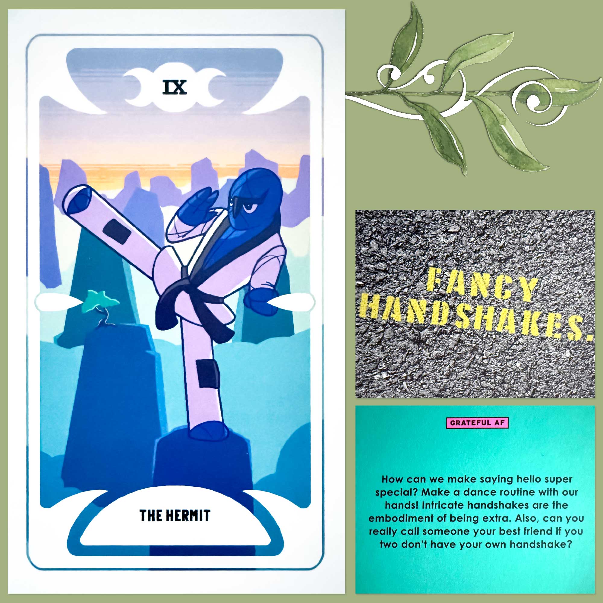 The Hermit was then joined by the “Fancy Handshakes” card from the Grateful AF deck, which says, “How can we make saying hello super special? Make a dance routine with our hands! Intricate handshakes are the embodiment of being extra. Also, how can you really call someone your best friend if you two don’t have your own handshake?”