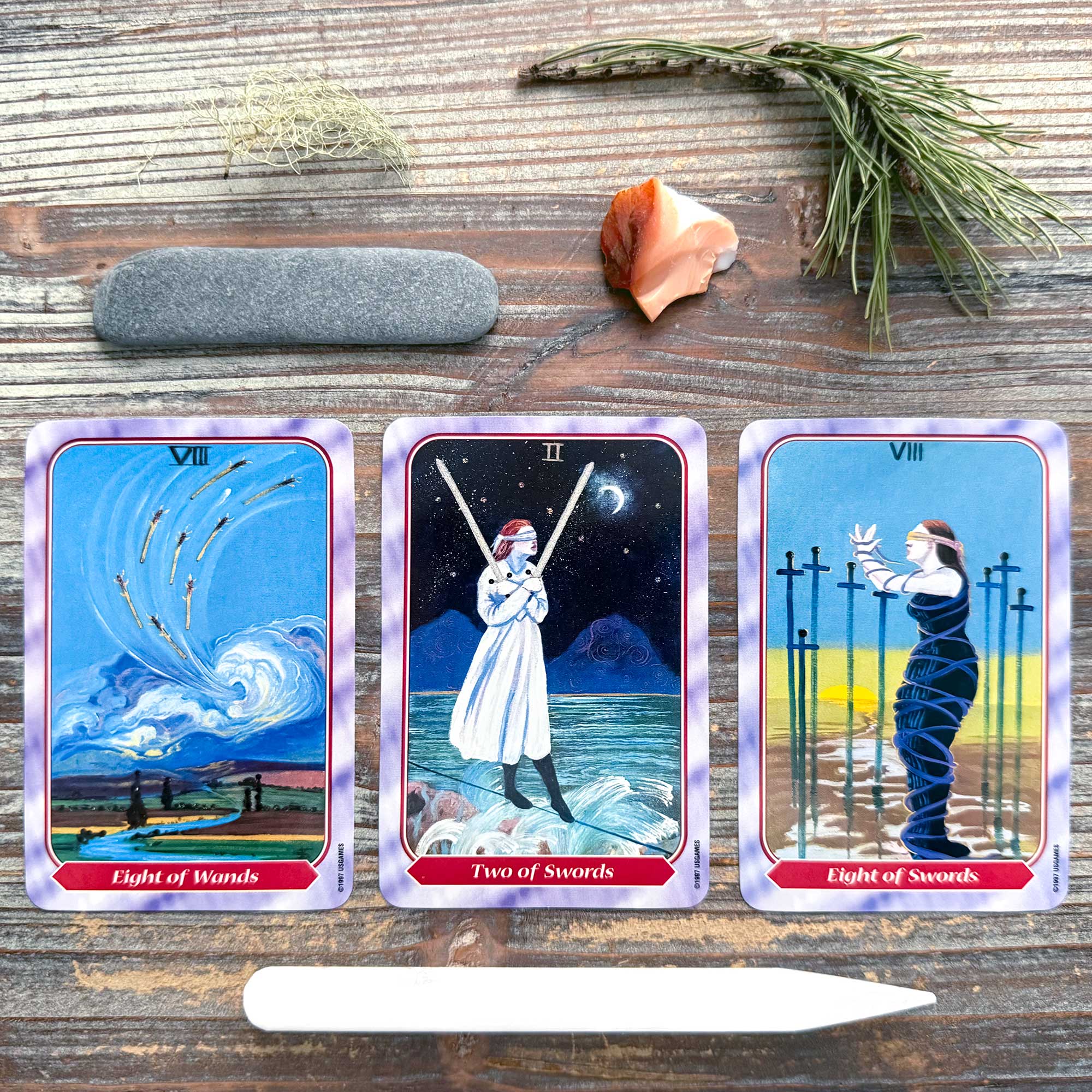 Reading Summary: You are ripping off blindfolds that have kept you trapped and motionless to identify issues (Eight of Swords figure reaching out for help from the Two of Swords figure) and have already begun making the decisions needed (Two of Swords figure moving on a tight rope toward Eight of Swords figure) and actions necessary begin fixing them (Eight of Wands).