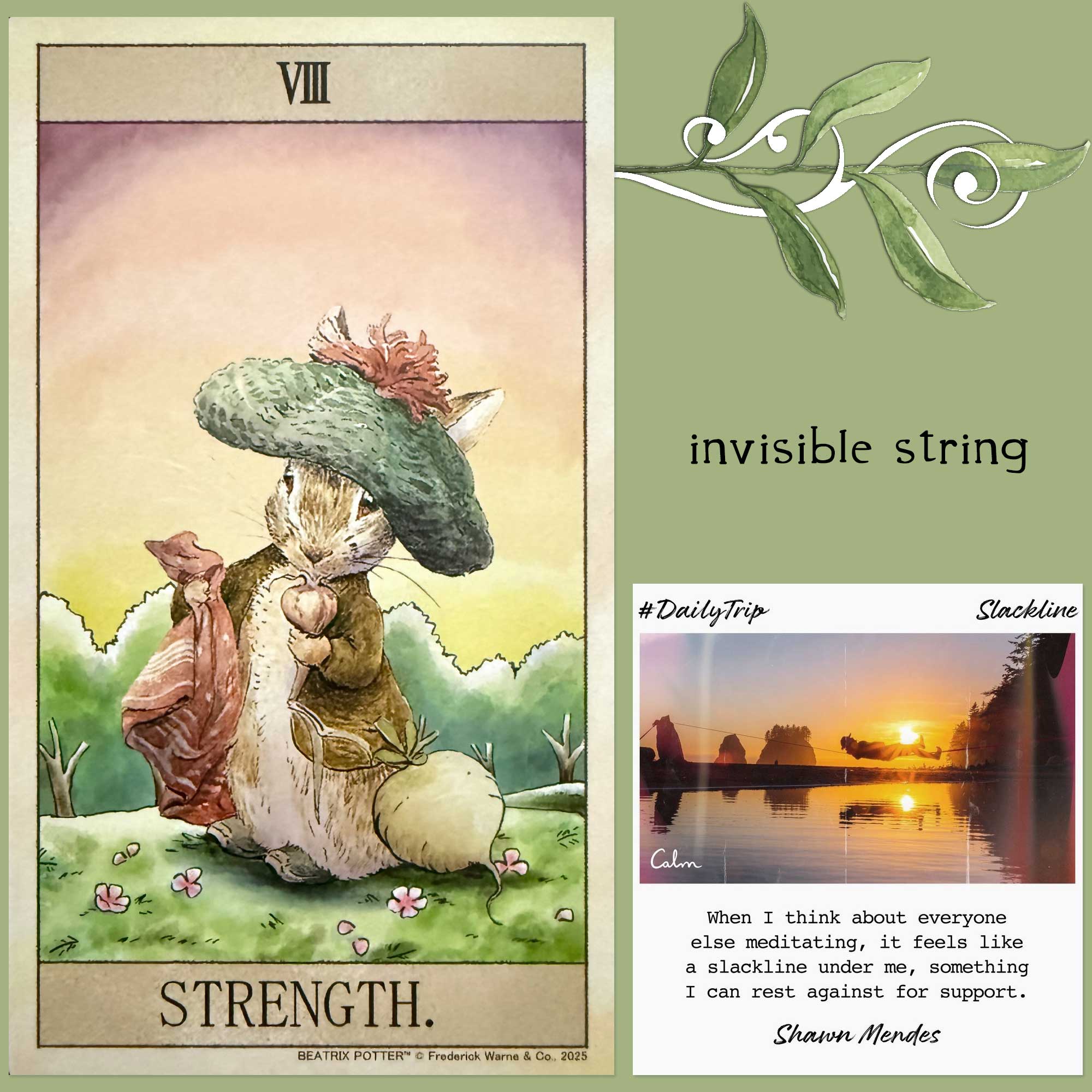 The prompt “invisible string” immediately made me think of this advice when combined with the Strength card. I might sound like an old lady here, but posture is important. Not just during meditation, but how we carry ourselves is important.