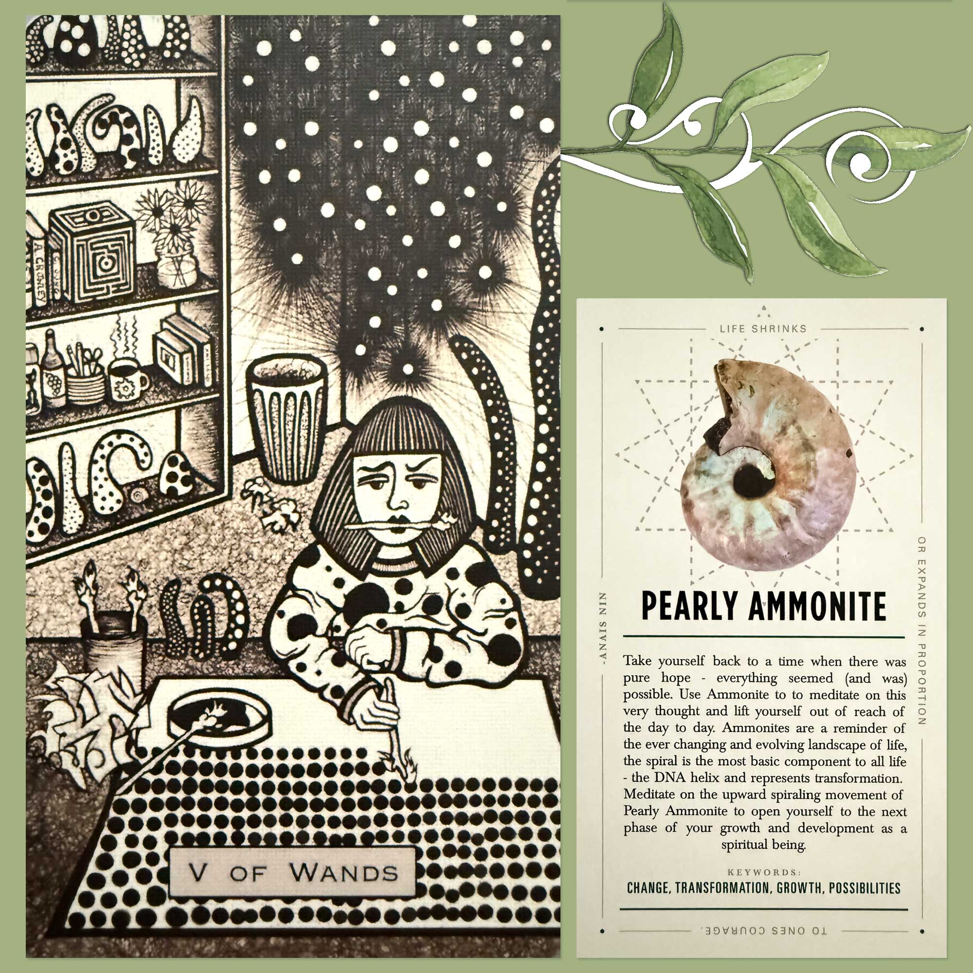 The Five of Wands has then been combined with the Pearly Ammonite card from the Lavish Earth Crystal Affirmation deck, which quotes Anais Nin to say, “ Life shrinks or expands in proportion to one’s courage.”