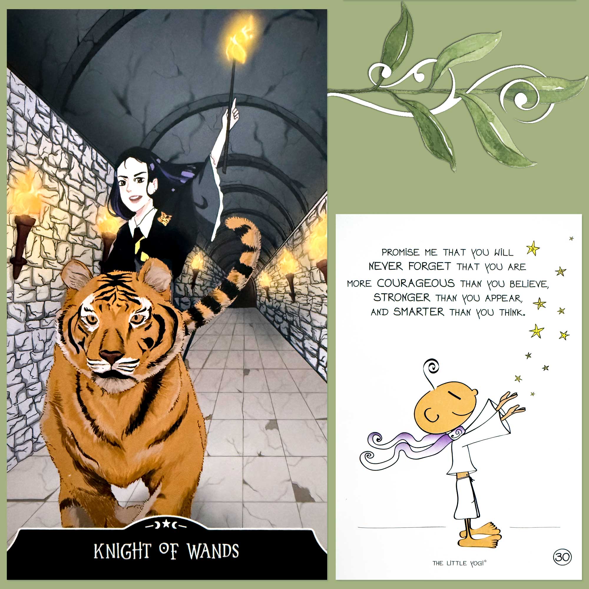 The Knight of Wands has then been combined with an affirmation card from the Little Yogi Happy Notes deck, which says, “Promise me that you will never forget that you are more courageous than you believe, stronger than you appear, and smarter than you think.”
