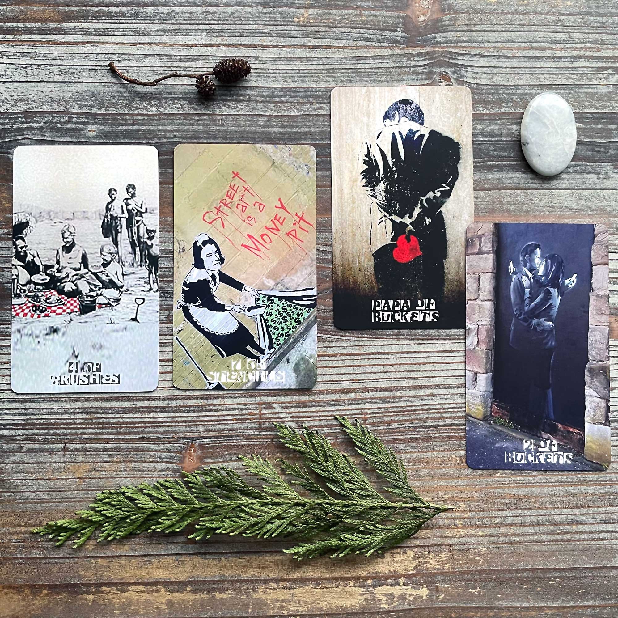 In the echo of shape and theme between the balloons in the Queen of Brushes and the anchor card there is indication that this doesn’t have to be a heavy process. There’s nothing studious or particularly hard about it, you just need to welcome back in that nonconformity within your soul (burning flag and spray painted anarchy sign), and let it flourish and stretch its wings (back to the copious amounts of butterflies in the anchor card).