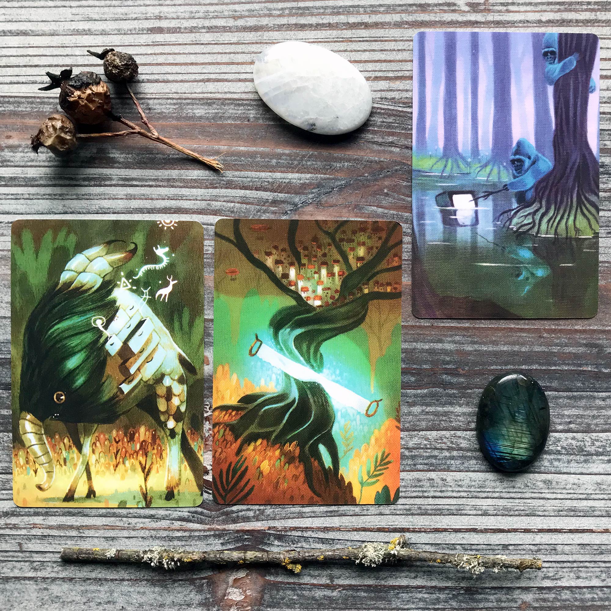 Reading Summary: There is a connection between the three cards in the shades of green that blend between them. This connection brings together the three cards meanings, threading their stories together.
