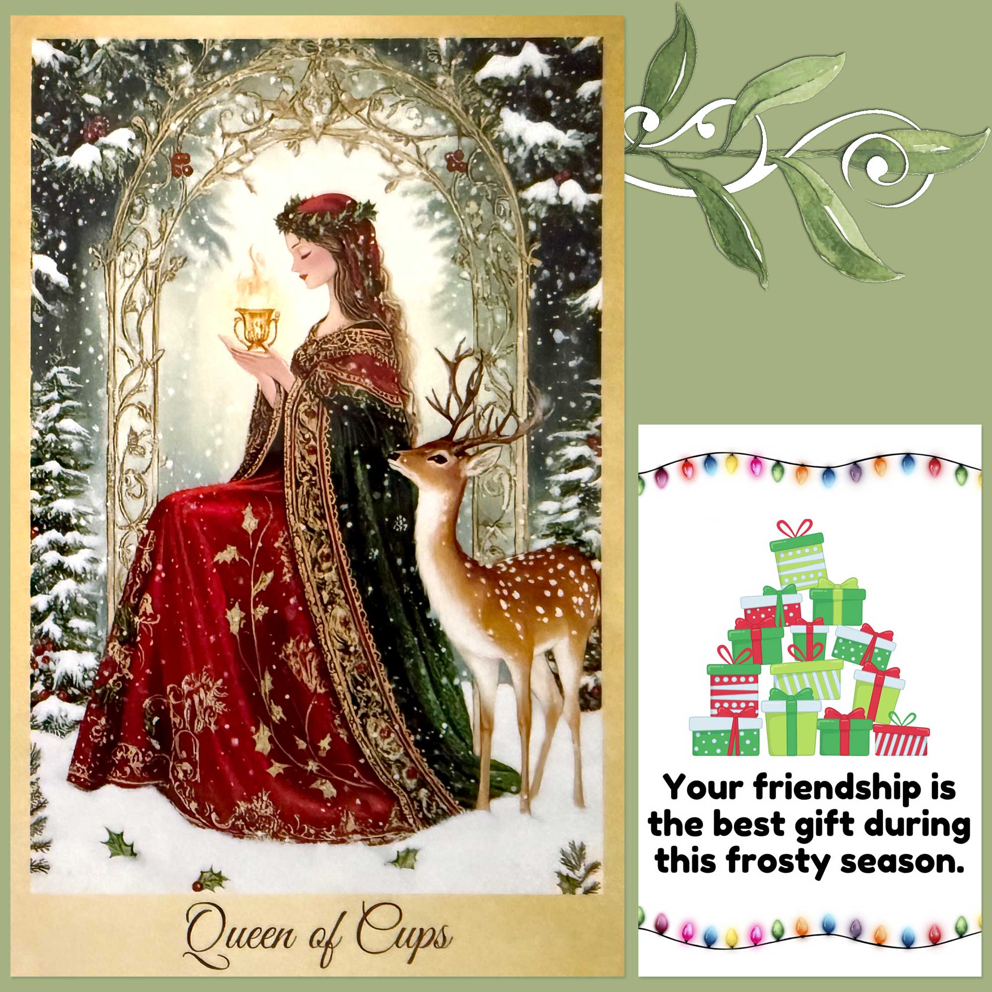 The Queen of Cups has then been combined with one of my Christmas Affirmation cards, which says, “Your friendship is the best gift during this frosty season.”