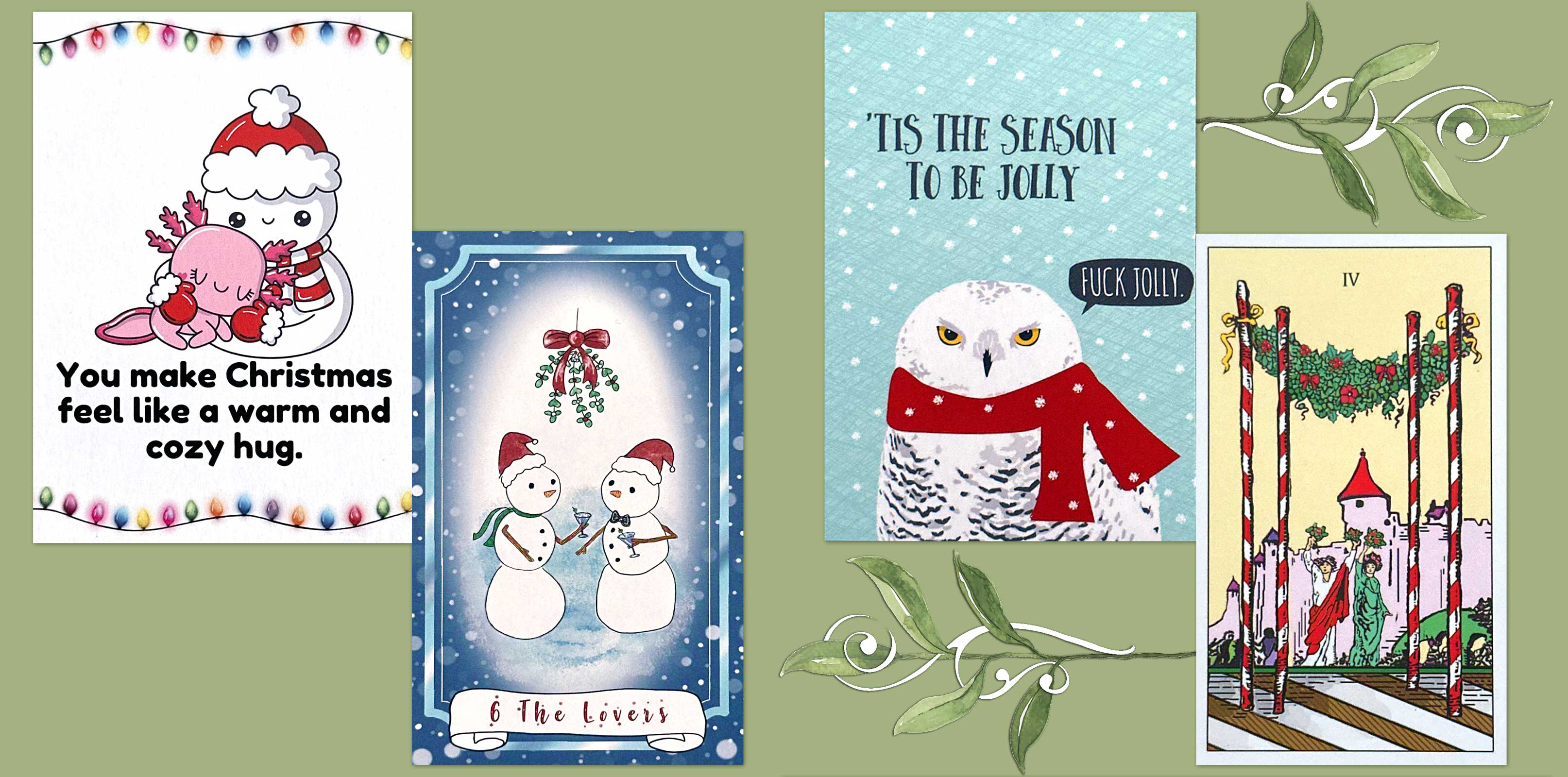 Today’s card is the Four of Wands combined with the affirmation “Tis the season to be jolly. Fuck jolly.”