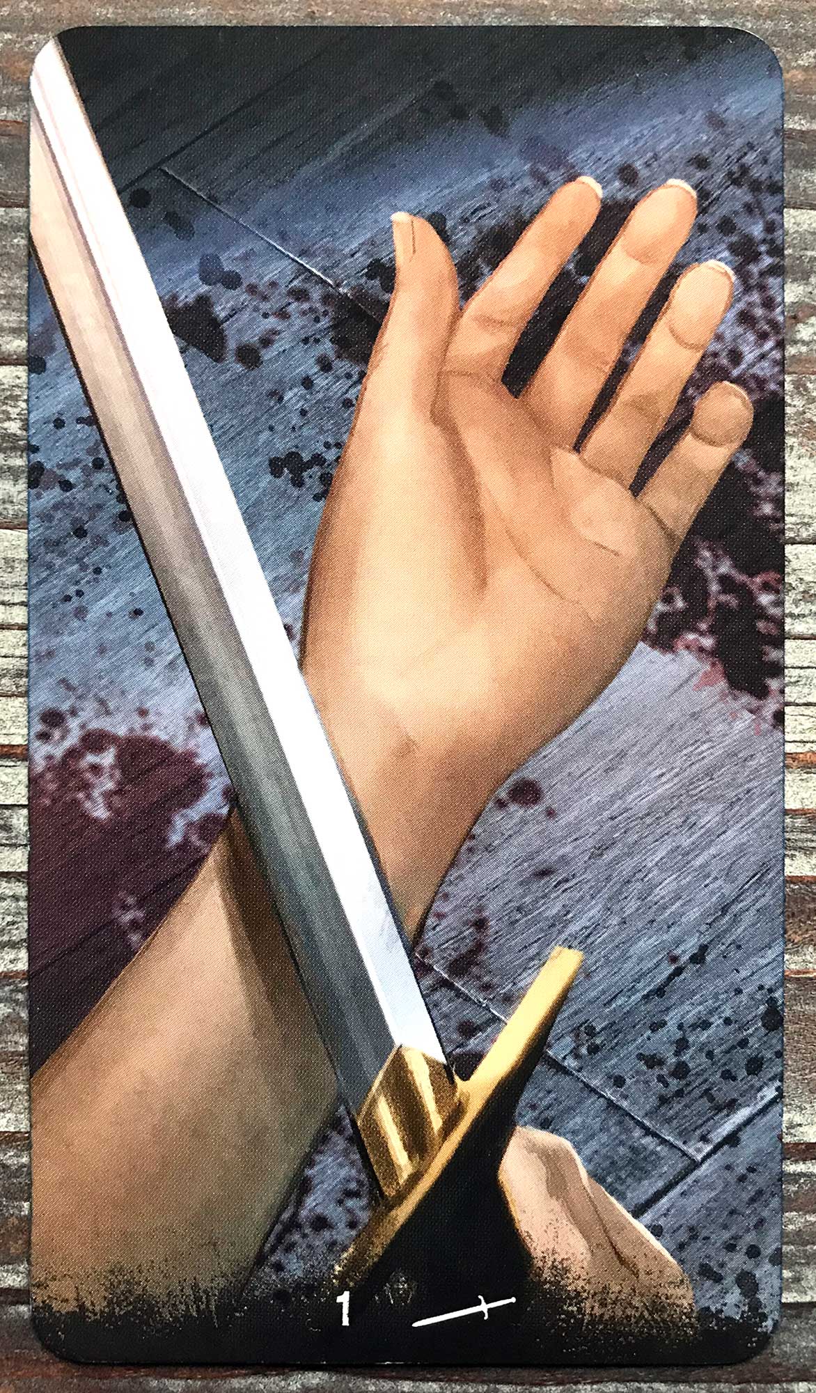 What stands out to me in this card is the position of the hand that is holding the knife. In this position, it is poised to press down and slice which indicates to me that this is a prime position for suicide.
