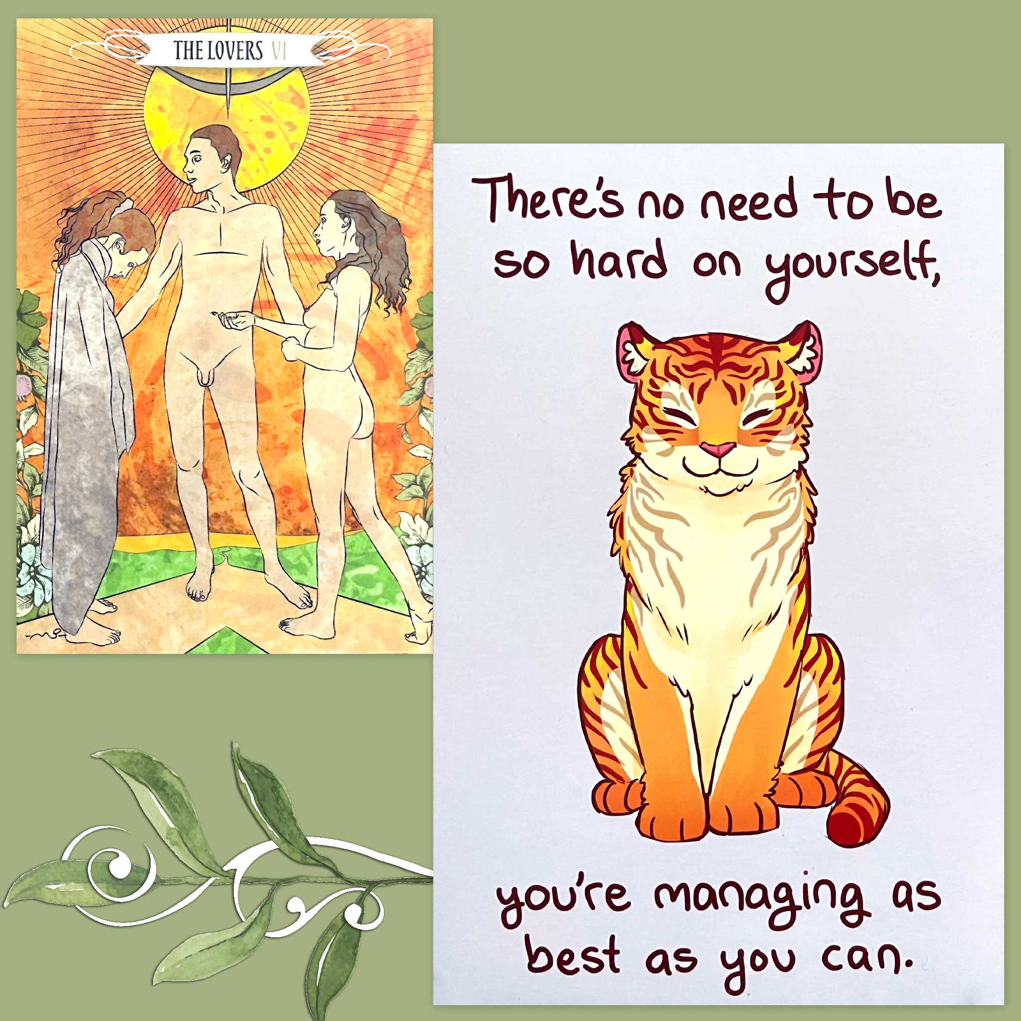 The imagery here in this card is very Marsielle inspired with the man who must choose between two women. In the Marseille tarot, these women are often depicted as a love interest and a mother figure, in that age old tug of war that happens in familial relationships.