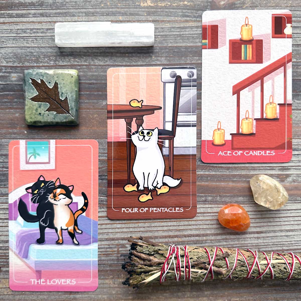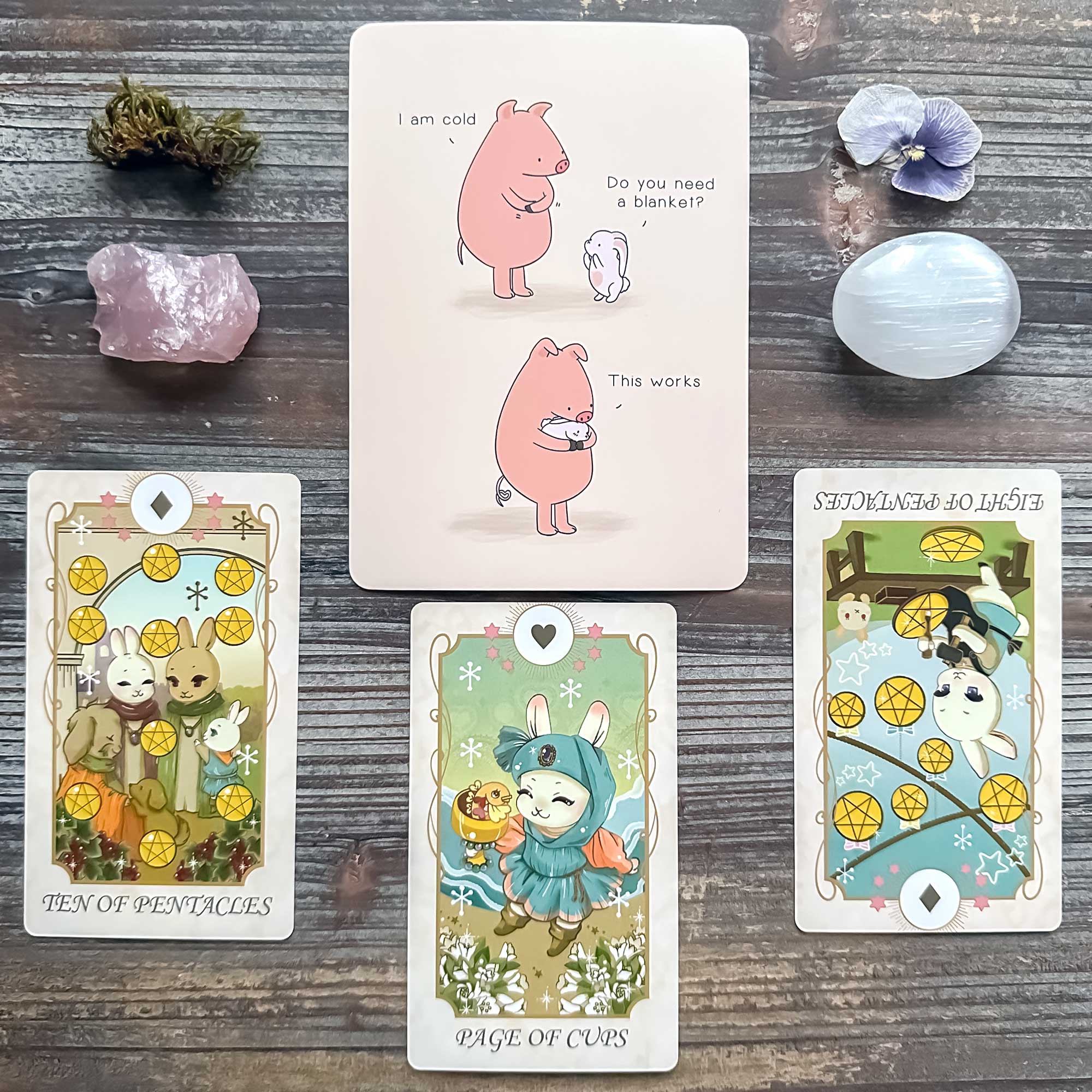 King of Pentacles – Stay on target with your goals and grounded in what you want to achieve. Even kings need to rest now and then (note, the lion’s eyes are closed). This rest is not detrimental, but a necessary part of creating stability.
