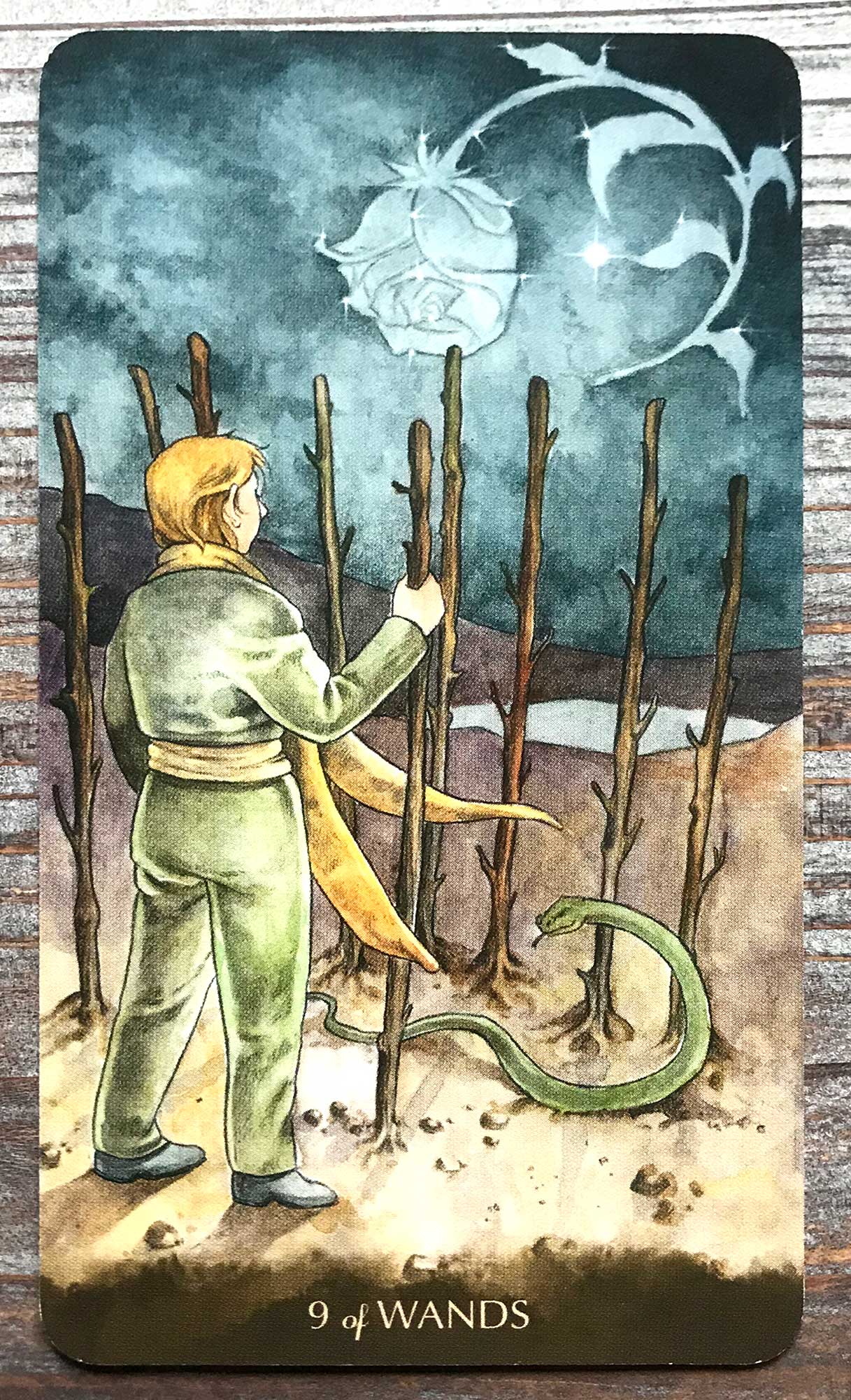 Tarot of the Little Prince - Nine of WandsToday’s draw is the Nine of Wands, which is traditionally a representation of setting boundaries and resilience in the face of adversity.