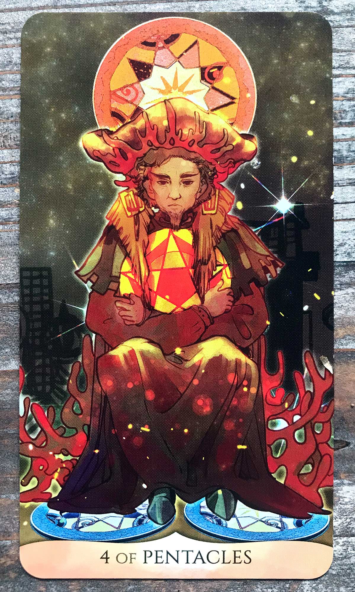 Traditional Manga Tarot - Four of PentaclesToday’s draw is is the Four of Pentacles, which is traditionally interpreted as a solidly grounded message of stability and security.  This can often also lead to interpretations of too much stability or too much security as seen in one that is miserly or greedy.