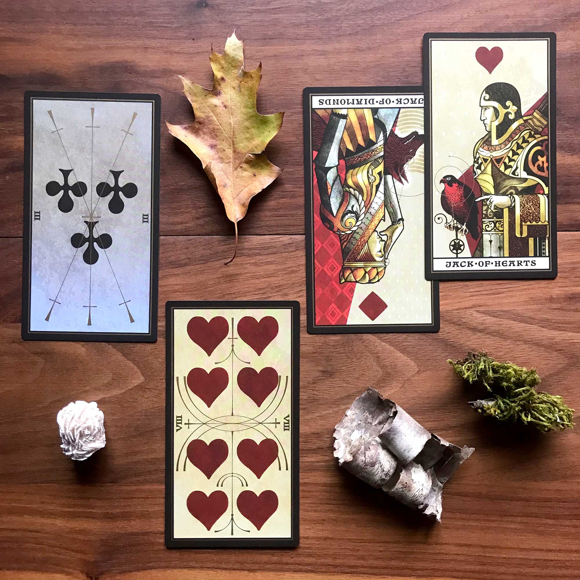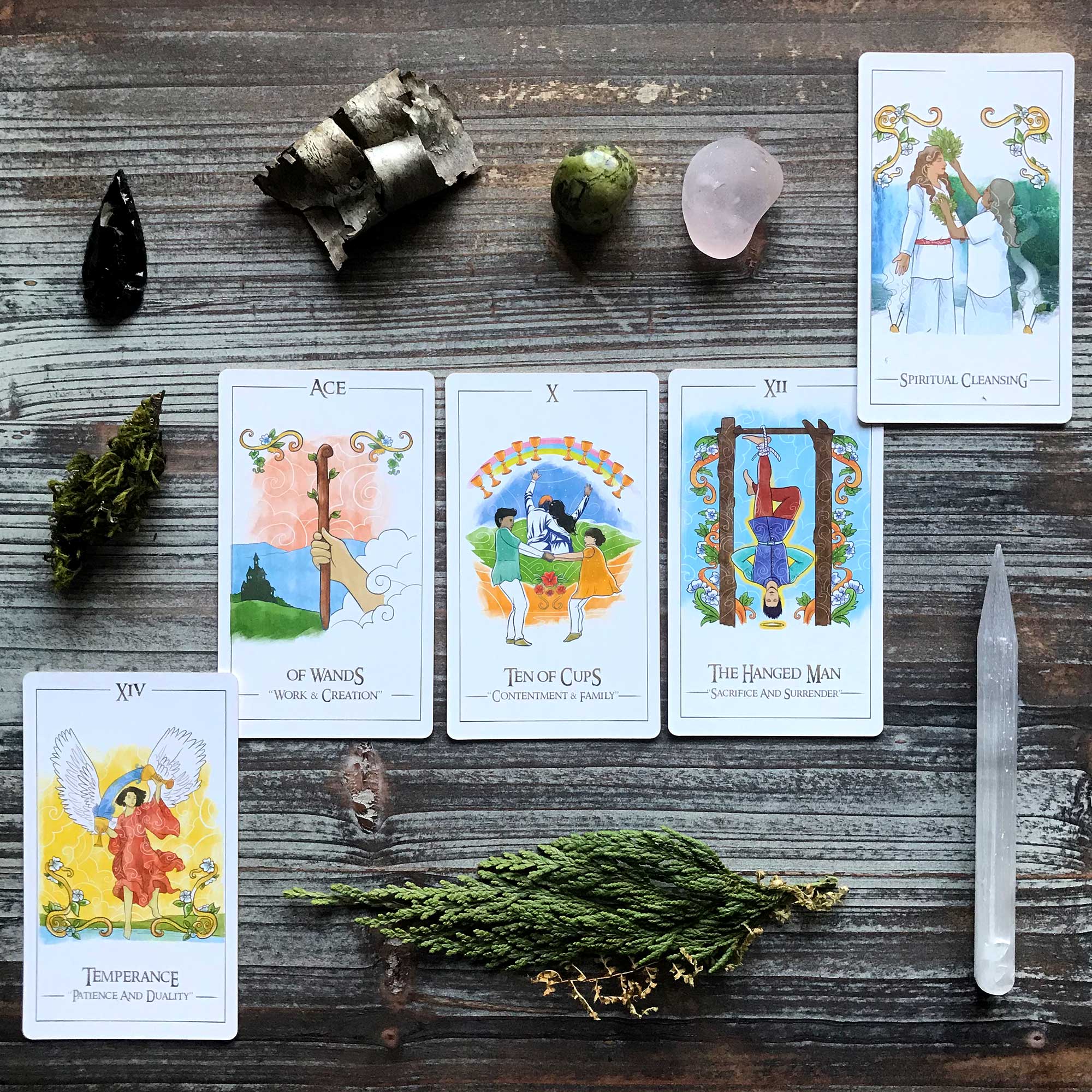 The Adjustment card with the Eight of Wands indicates that one should go swiftly towards doing the right thing. Adjustment/Justice is about cause and effect and “the law” (whether that be the laws of nature or the laws of man). The Eight of Wands is about swift action. These cards indicate that it is important to not just do the right thing, but to do so without hesitation.
