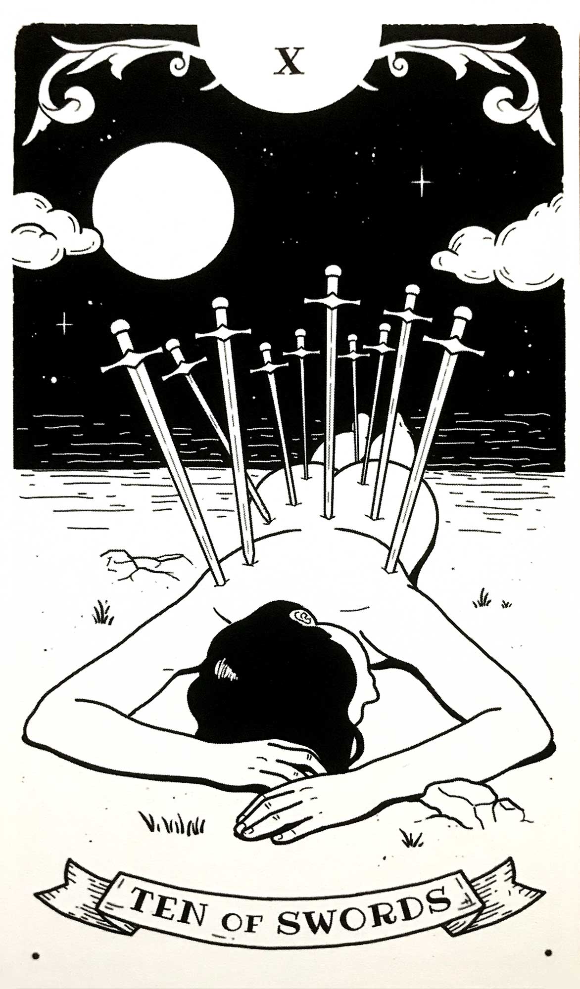 Today’s draw is the Ten of Swords, which is traditionally about painful endings and finding yourself at the end of a difficult journey with lots of struggle and strife. It can also be a representation of loss, betrayal, or coming out at the end of something feeling crippled in some way.