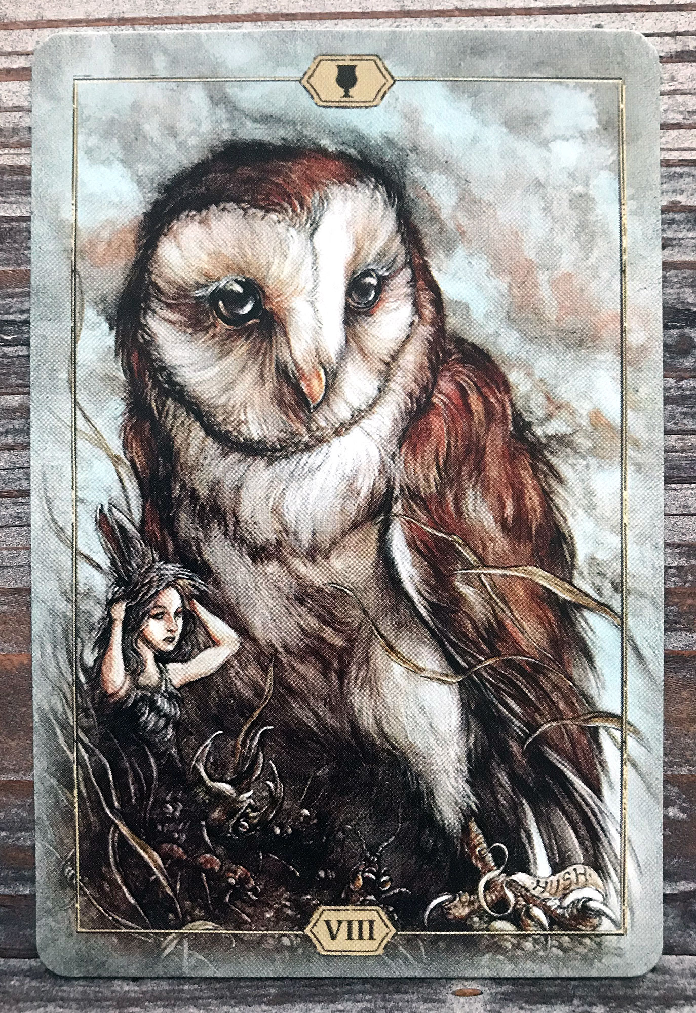 What stands out to me in this card is the Fae girl in the lower left corner and the fact that she is pulling on (or off) a hood/headdress that had her concealed as a blackbird. This brought to mind the phrase “a wolf in sheep’s clothing”, which then had me wondering… who is she hiding from? What is it she hides from? What has she need to retreat from or distance herself from that she has to conceal herself under the cloak of feathers?