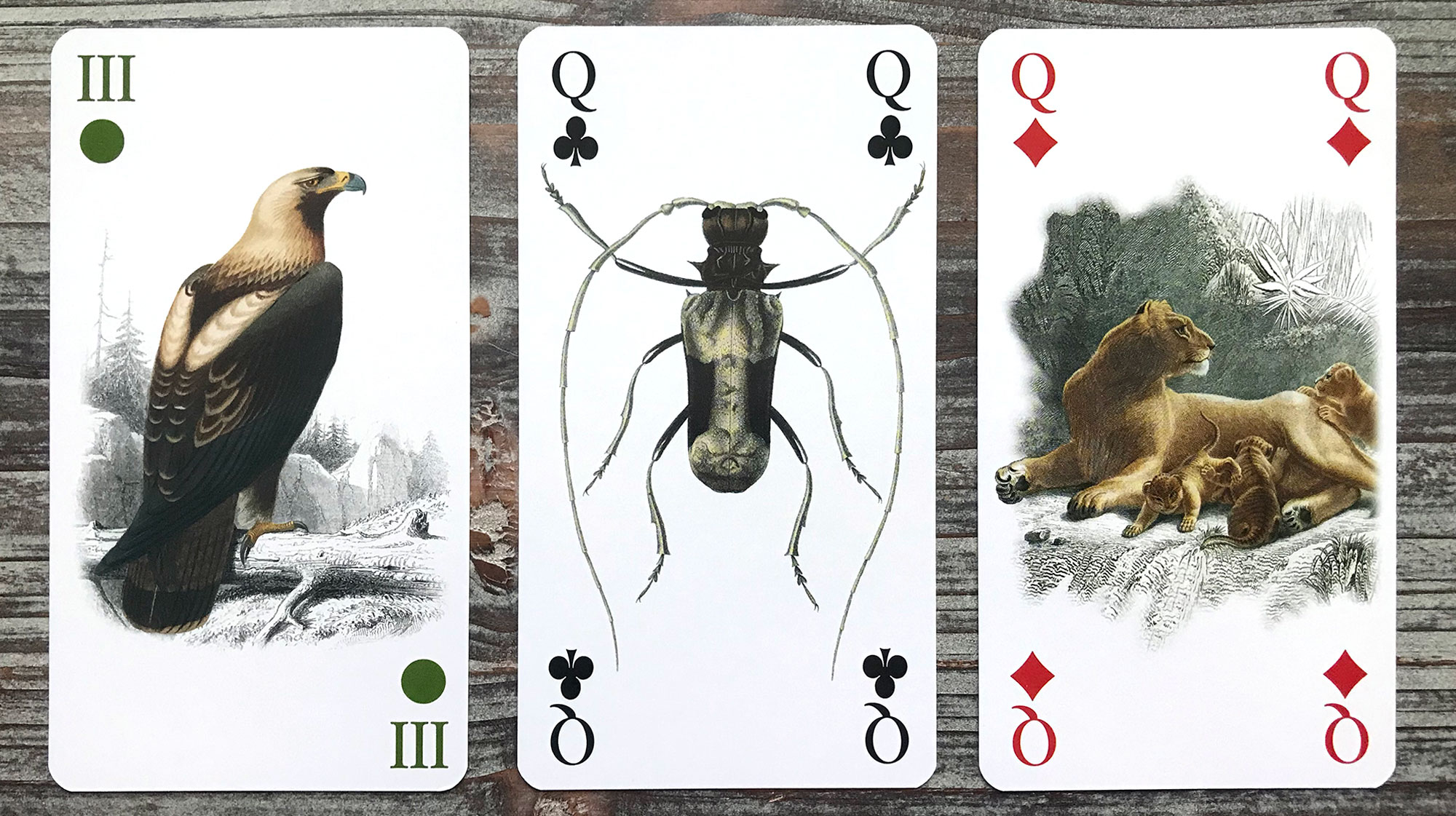 Reading Summary: Nurturing strength and dignity (Empress/Eagle) combined with a passionate pursuit of dreams (Queen of Clubs/Longhorn Beetle) and an unrelenting foundational strength (Queen of Diamonds/Lion).