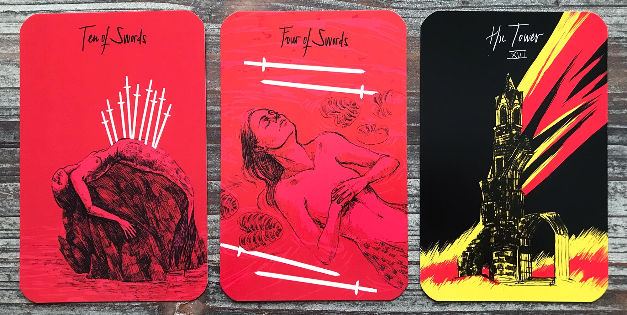 Reading Summary: Hol-eee-shit. *Eyes the cards.* Okay so if I was more mindful right now I’d be feeling a good deal more defeated (Ten of Swords) and in need of rest and retreat because the world (Four of Swords) would feel like everything is falling apart (The Tower).