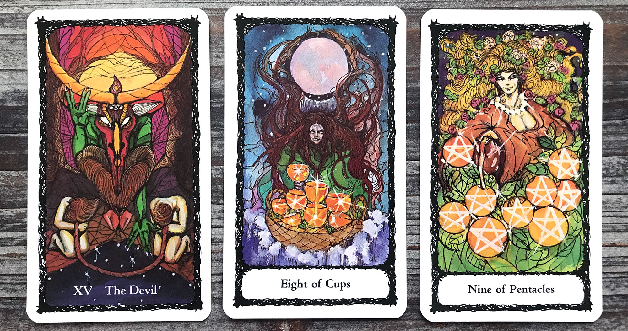 Reading Summary: Pay attention to avoidance strategies (The Devil and Eight of Cups)… and focus on what is been accomplished and what’s good in your life (Nine of Pentacles).