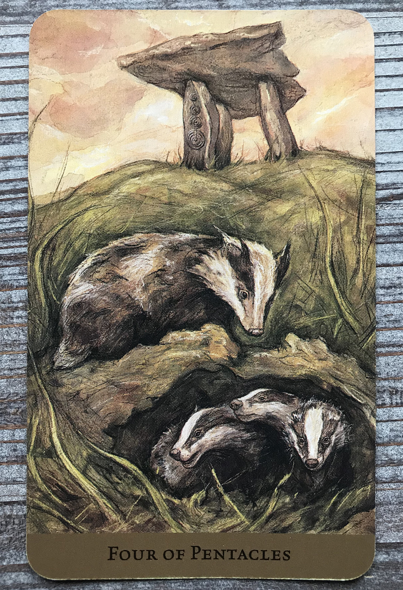 Today’s draw is the Four of Pentacles, which is traditionally a representation of stability and security in the areas of finance, resources, hearth and home, health, and manifestations. It’s about conservation of resources and creating a sense of security by having what one needs.