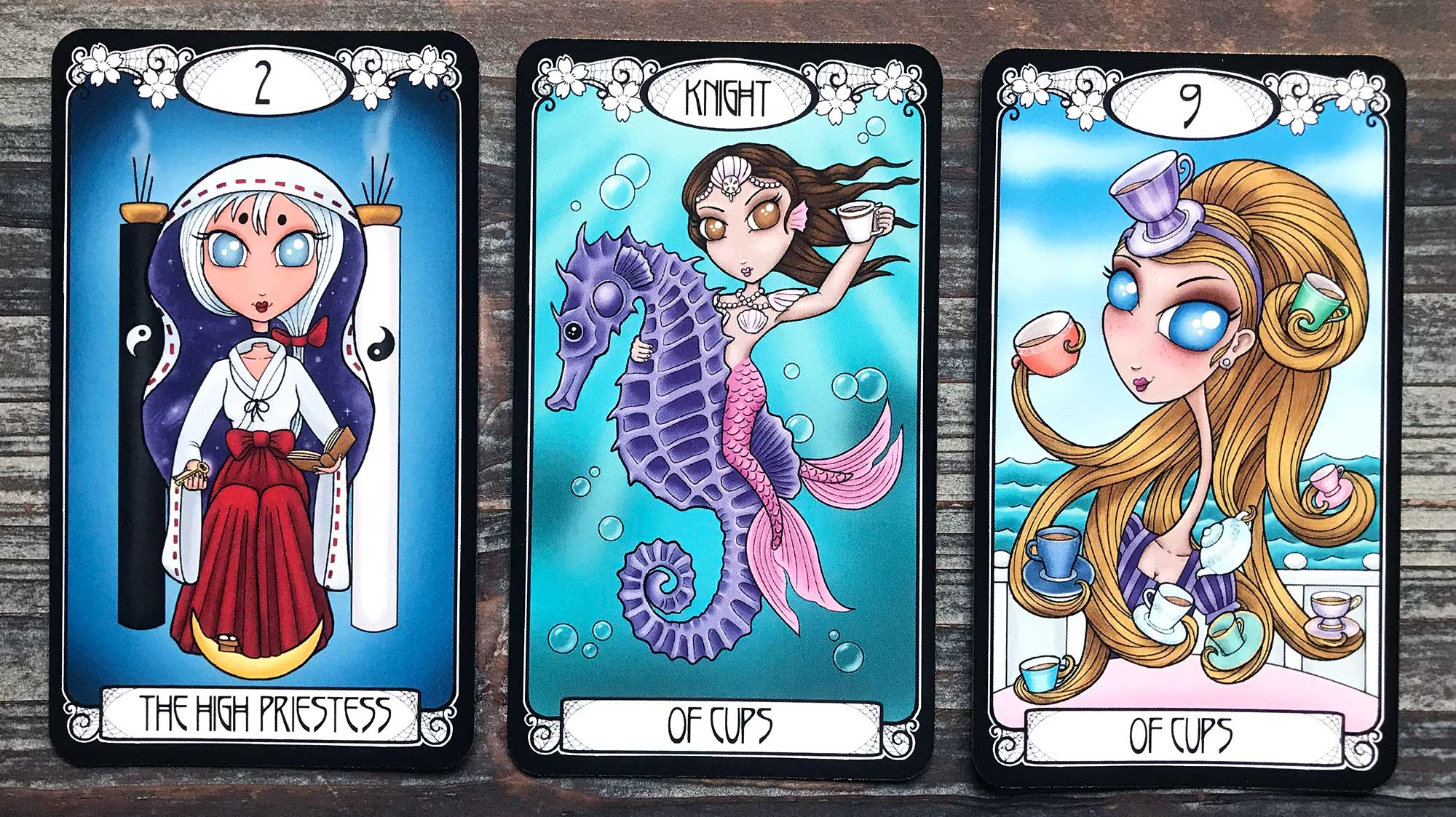 Reading Summary: I am open to my intuition (The High Priestess) and willing to follow where it leads (Knight of Cups), and in doing so, embrace the results as they pour in along the way (Nine of Cups).