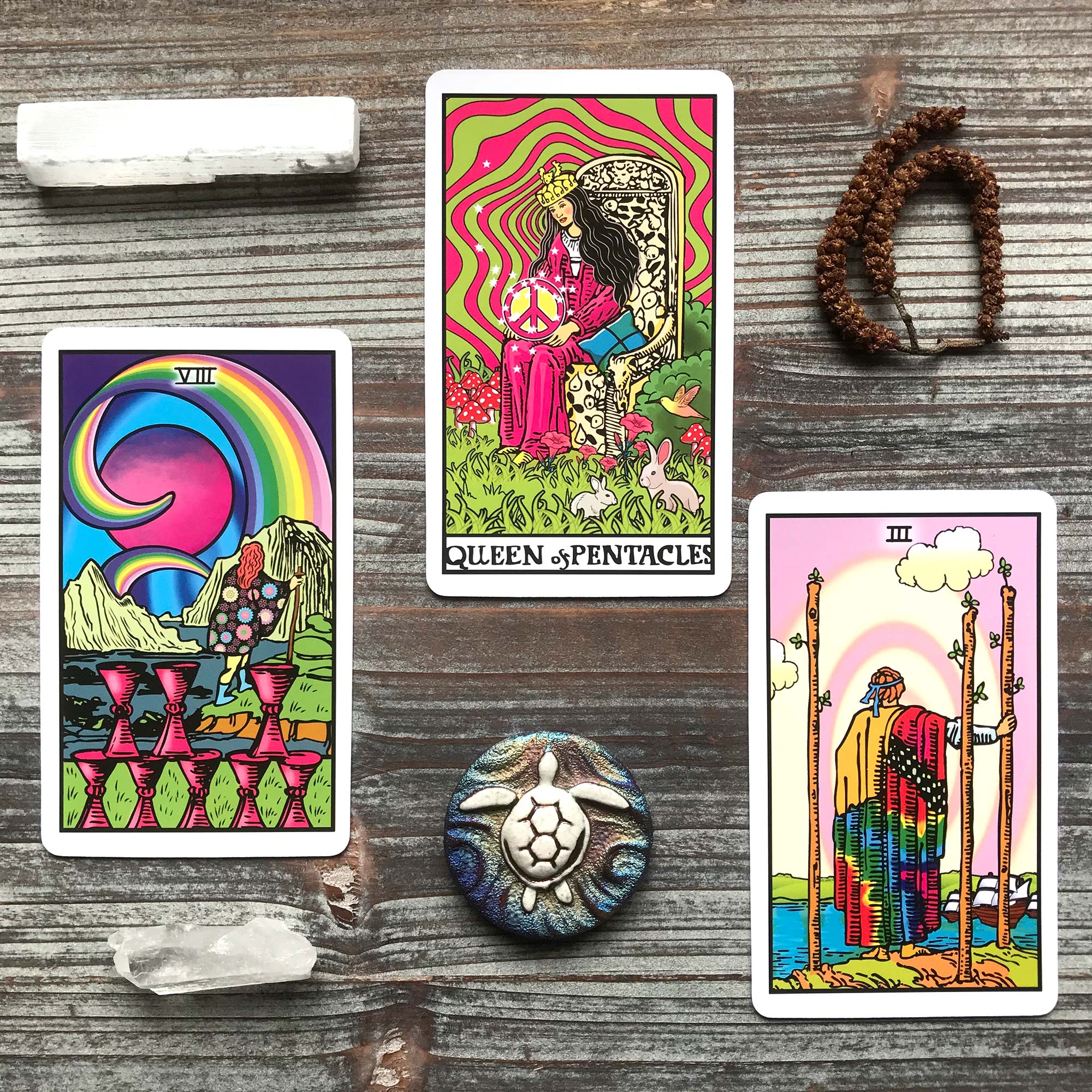 Reading Summary: Take the first step beyond planning (Three of Wands). Choose a direction and step off the teeter totter (Two of Pentacles Rx). Follow what is stirring your interest at this time and claim these interests as yours (Queen of Wands).