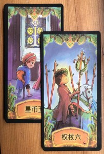 Today’s draw is the Five of Pentacles, and the Six of Wands. Neither of them is a jumper, but instead they were stuck together when they Emerged from the deck.